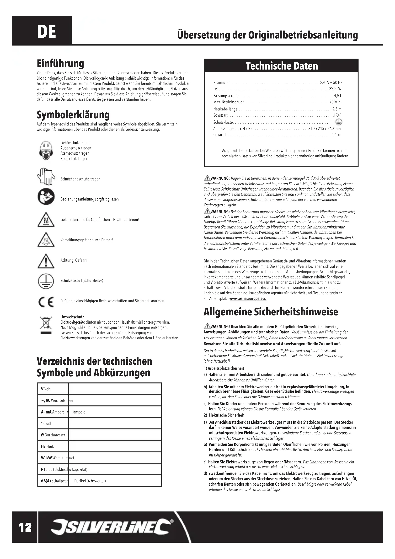 WARNUNG: Tragen Sie in Bereichen, in denen der Lärmpegel 85 dB(A) überschreitet, unbedingt angemessenen Gehörschutz und begrenzen Sie nach Möglichkeit die Belastungsdauer. Sollte trotz Gehörschutz Unbehagen irgendeiner Art auftreten, beenden Sie die Arbeit unverzüglich und überprüfen Sie den Gehörschutz auf korrekten Sitz und Funktion und stellen Sie sicher, dass dieser einen angemessenen Schutz für den Lärmpegel bietet, der von den verwendeten Werkzeugen ausgeht. WARNUNG: Bei der Benutzung mancher Werkzeuge wird der Benutzer Vibrationen ausgesetzt, welche zum Verlust des Tastsinns, zu Taubheitsgefühl, Kribbeln und zu einer Verminderung der Handgreifkraft führen können. Langfristige Belastung kann zu chronischen Beschwerden führen. Begrenzen Sie, falls nötig, die Exposition zu Vibrationen und tragen Sie vibrationsmindernde Handschuhe. Verwenden Sie dieses Werkzeug nicht mit kalten Händen, da Vibrationen bei Temperaturen unter dem individuellen Komfortbereich eine stärkere Wirkung zeigen. Beurteilen Sie die Vibrationsbelastung unter Zuhilfenahme der Technischen Daten des jeweiligen Werkzeuges und bestimmen Sie die zulässige Belastungsdauer und -häugkeit.DieindenTechnischenDatenangegebenenGeräusch-undVibrationsinformationenwerden nach internationalen Standards bestimmt. Die angegebenen Werte beziehen sich auf eine normaleBenutzungdesWerkzeugesunternormalenArbeitsbedingungen.Schlechtgewartete,inkorrektmontierteundunsachgemäßverwendeteWerkzeugekönnenerhöhteSchallpegel undVibrationswerteaufweisen.WeitereInformationenzurEU-Vibrationsrichtlinieundzu Schall-sowieVibrationsbelastungen,dieauchfürHeimanwenderrelevantseinkönnen, ndenSieaufdenSeitenderEuropäischenAgenturfürSicherheitundGesundheitsschutz am Arbeitsplatz: www.osha.europa.eu. Allgemeine Sicherheitshinweise WARNUNG! Beachten Sie alle mit dem Gerät gelieferten Sicherheitshinweise, Anweisungen, Abbildungen und technischen Daten. Versäumnisse bei der Einhaltung der Anweisungen können elektrischen Schlag, Brand und/oder schwere Verletzungen verursachen.Bewahren Sie alle Sicherheitshinweise und Anweisungen für die Zukunft auf.Der in den Sicherheitshinweisen verwendete Begriff „Elektrowerkzeug“ bezieht sich auf netzbetriebene Elektrowerkzeuge (mit Netzkabel) und auf akkubetriebene Elektrowerkzeuge (ohne Netzkabel).1) Arbeitsplatzsicherheita) Halten Sie Ihren Arbeitsbereich sauber und gut beleuchtet. Unordnung oder unbeleuchtete Arbeitsbereiche können zu Unfällen führen.b) Arbeiten Sie mit dem Elektrowerkzeug nicht in explosionsgefährdeter Umgebung, in der sich brennbare Flüssigkeiten, Gase oder Stäube benden. Elektrowerkzeuge erzeugen Funken, die den Staub oder die Dämpfe entzünden können.c) Halten Sie Kinder und andere Personen während der Benutzung des Elektrowerkzeugs fern. Bei Ablenkung können Sie die Kontrolle über das Gerät verlieren.2) Elektrische Sicherheita) Der Anschlussstecker des Elektrowerkzeuges muss in die Steckdose passen. Der Stecker darf in keiner Weise verändert werden. Verwenden Sie keine Adapterstecker gemeinsam mit schutzgeerdeten Elektrowerkzeugen. Unveränderte Stecker und passende Steckdosen verringern das Risiko eines elektrischen Schlages.b) Vermeiden Sie Körperkontakt mit geerdeten Oberächen wie von Rohren, Heizungen, Herden und Kühlschränken. Es besteht ein erhöhtes Risiko durch elektrischen Schlag, wenn Ihr Körper geerdet ist.c) Halten Sie Elektrowerkzeuge von Regen oder Nässe fern. Das Eindringen von Wasser in ein Elektrowerkzeug erhöht das Risiko eines elektrischen Schlages.d) Zweckentfremden Sie das Kabel nicht, um das Elektrowerkzeug zu tragen, aufzuhängen oder um den Stecker aus der Steckdose zu ziehen. Halten Sie das Kabel fern von Hitze, Öl, scharfen Kanten oder sich bewegenden Geräteteilen. Beschädigte oder verwickelte Kabel erhöhen das Risiko eines elektrischen Schlages. Übersetzung der Originalbetriebsanleitung Verzeichnis der technischen Symbole und Abkürzungen Symbolerklärung AufdemTypenschilddesProduktssindmöglicherweiseSymboleabgebildet.SievermittelnwichtigeInformationenüberdasProduktoderdienenalsGebrauchsanweisung.Gehörschutz tragen Augenschutz tragenAtemschutz tragenKopfschutz tragenSchutzhandschuhe tragenBedienungsanleitung sorgfältig lesenGefahrdurchheißeOberächen–NICHTberühren!VerbrühungsgefahrdurchDampf!Achtung, Gefahr!Schutzklasse I (Schutzleiter)ErfülltdieeinschlägigenRechtsvorschriftenundSicherheitsnormen.