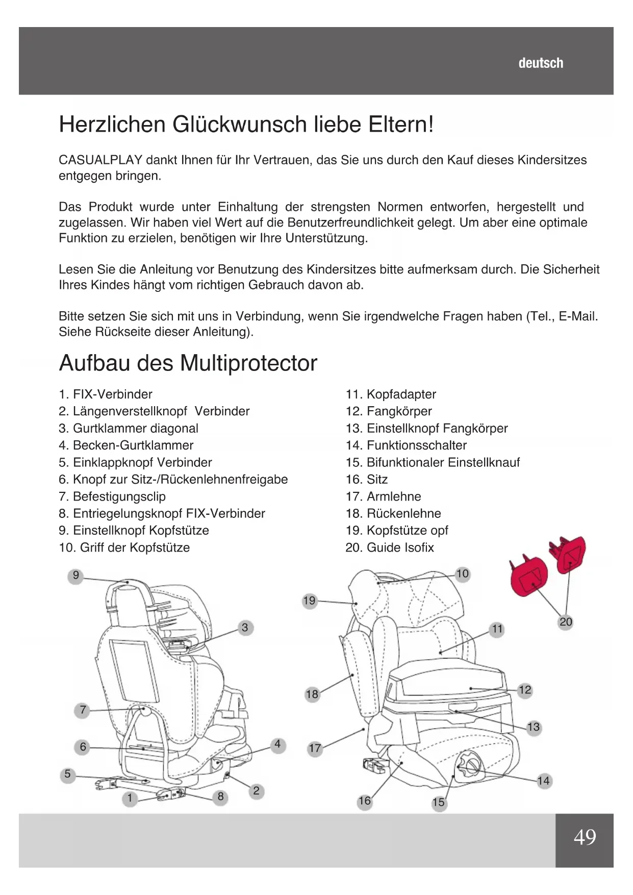 Herzlichen Glückwunsch liebe Eltern! CASUALPLAY dankt Ihnen für Ihr Vertrauen, das Sie uns durch den Kauf dieses Kindersitzes entgegen bringen. Das Produkt wurde unter Einhaltung der strengsten Normen entworfen, hergestellt und zugelassen. Wir haben viel Wert auf die Benutzerfreundlichkeit gelegt. Um aber eine optimale Funktion zu erzielen, benötigen wir Ihre Unterstützung. Lesen Sie die Anleitung vor Benutzung des Kindersitzes bitte aufmerksam durch. Die Sicherheit Ihres Kindes hängt vom richtigen Gebrauch davon ab. Bitte setzen Sie sich mit uns in Verbindung, wenn Sie irgendwelche Fragen haben (Tel., E-Mail. Siehe Rückseite dieser Anleitung). Aufbau des Multiprotector deutsch50 WICHTIg Der Kindersitz ist ausschließlich zum Einsatz in Fahrzeugen geeignet, die einen Dreipunkt-Sicherheitsgurt mit Gurtstraffer besitzen, der der UN/ECE-16 Regelung oder einer anderen gleichwertigen Norm entspricht. WARNUNg
