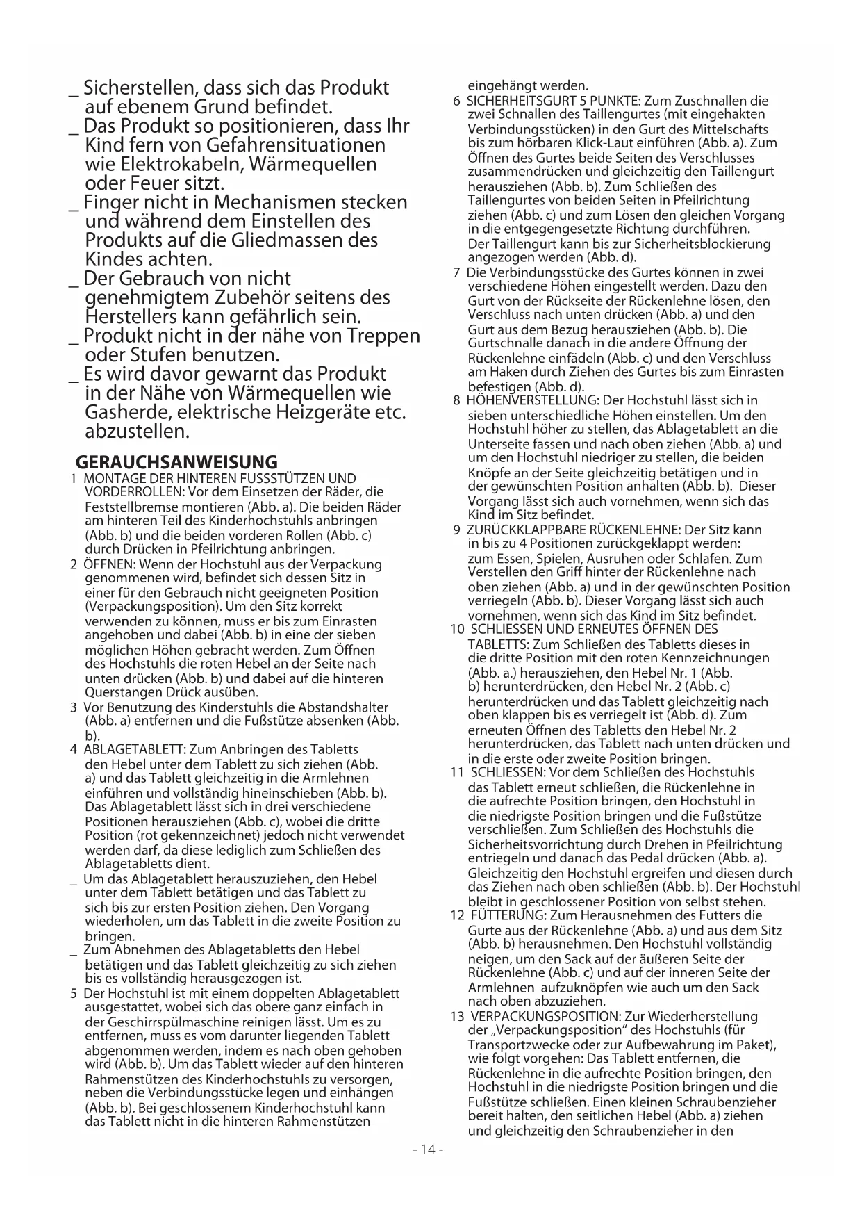 VORDERROLLEN: Vor dem Einsetzen der Räder, die Feststellbremse montieren (Abb. a). Die beiden Räder am hinteren Teil des Kinderhochstuhls anbringen (Abb. b) und die beiden vorderen Rollen (Abb. c) durch Drücken in Pfeilrichtung anbringen. 2 ÖFFNEN: Wenn der Hochstuhl aus der Verpackung genommenen wird, befindet sich dessen Sitz in einer für den Gebrauch nicht geeigneten Position (Verpackungsposition). Um den Sitz korrekt verwenden zu können, muss er bis zum Einrasten angehoben und dabei (Abb. b) in eine der sieben möglichen Höhen gebracht werden. Zum Öffnen des Hochstuhls die roten Hebel an der Seite nach unten drücken (Abb. b) und dabei auf die hinteren Querstangen Drück ausüben. 3 Vor Benutzung des Kinderstuhls die Abstandshalter (Abb. a) entfernen und die Fußstütze absenken (Abb. b). 4 ABLAGETABLETT: Zum Anbringen des Tabletts den Hebel unter dem Tablett zu sich ziehen (Abb. a) und das Tablett gleichzeitig in die Armlehnen einführen und vollständig hineinschieben (Abb. b). Das Ablagetablett lässt sich in drei verschiedene Positionen herausziehen (Abb. c), wobei die dritte Position (rot gekennzeichnet) jedoch nicht verwendet werden darf, da diese lediglich zum Schließen des Ablagetabletts dient. _ Um das Ablagetablett herauszuziehen, den Hebel unter dem Tablett betätigen und das Tablett zu sich bis zur ersten Position ziehen. Den Vorgang wiederholen, um das Tablett in die zweite Position zu bringen. _ Zum Abnehmen des Ablagetabletts den Hebel betätigen und das Tablett gleichzeitig zu sich ziehen bis es vollständig herausgezogen ist. 5 Der Hochstuhl ist mit einem doppelten Ablagetablett ausgestattet, wobei sich das obere ganz einfach in der Geschirrspülmaschine reinigen lässt. Um es zu entfernen, muss es vom darunter liegenden Tablett abgenommen werden, indem es nach oben gehoben wird (Abb. b). Um das Tablett wieder auf den hinteren Rahmenstützen des Kinderhochstuhls zu versorgen, neben die Verbindungsstücke legen und einhängen (Abb. b). Bei geschlossenem Kinderhochstuhl kann das Tablett nicht in die hinteren Rahmenstützen eingehängt werden. 6 SICHERHEITSGURT 5 PUNKTE: Zum Zuschnallen die zwei Schnallen des Taillengurtes (mit eingehakten Verbindungsstücken) in den Gurt des Mittelschafts bis zum hörbaren Klick-Laut einführen (Abb. a). Zum Öffnen des Gurtes beide Seiten des Verschlusses zusammendrücken und gleichzeitig den Taillengurt herausziehen (Abb. b). Zum Schließen des Taillengurtes von beiden Seiten in Pfeilrichtung ziehen (Abb. c) und zum Lösen den gleichen Vorgang in die entgegengesetzte Richtung durchführen. Der Taillengurt kann bis zur Sicherheitsblockierung angezogen werden (Abb. d). 7 Die Verbindungsstücke des Gurtes können in zwei verschiedene Höhen eingestellt werden. Dazu den Gurt von der Rückseite der Rückenlehne lösen, den Verschluss nach unten drücken (Abb. a) und den Gurt aus dem Bezug herausziehen (Abb. b). Die Gurtschnalle danach in die andere Öffnung der Rückenlehne einfädeln (Abb. c) und den Verschluss am Haken durch Ziehen des Gurtes bis zum Einrasten befestigen (Abb. d). 8 HÖHENVERSTELLUNG: Der Hochstuhl lässt sich in sieben unterschiedliche Höhen einstellen. Um den Hochstuhl höher zu stellen, das Ablagetablett an die Unterseite fassen und nach oben ziehen (Abb. a) und um den Hochstuhl niedriger zu stellen, die beiden Knöpfe an der Seite gleichzeitig betätigen und in der gewünschten Position anhalten (Abb. b). Dieser Vorgang lässt sich auch vornehmen, wenn sich das Kind im Sitz befindet. 9 ZURÜCKKLAPPBARE RÜCKENLEHNE: Der Sitz kann in bis zu 4 Positionen zurückgeklappt werden: zum Essen, Spielen, Ausruhen oder Schlafen. Zum Verstellen den Griff hinter der Rückenlehne nach oben ziehen (Abb. a) und in der gewünschten Position verriegeln (Abb. b). Dieser Vorgang lässt sich auch vornehmen, wenn sich das Kind im Sitz befindet.