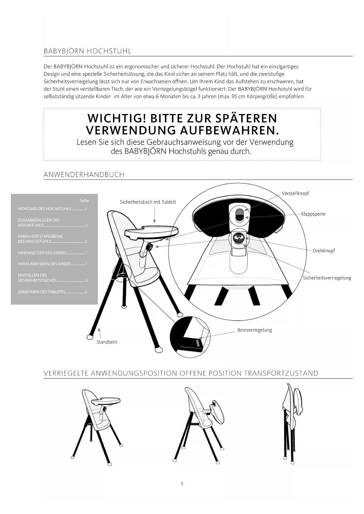 VERWENDUNG AUFBEWAHREN. Lesen Sie sich diese Gebrauchsanweisung vor der Verwendung des BABYBJÖRN Hochstuhls genau durch. Sicherheitstisch mit Tablett Verstellknopf Klappsperre Drehknopf Beinverriegelung Standbein Sicherheitsverriegelung