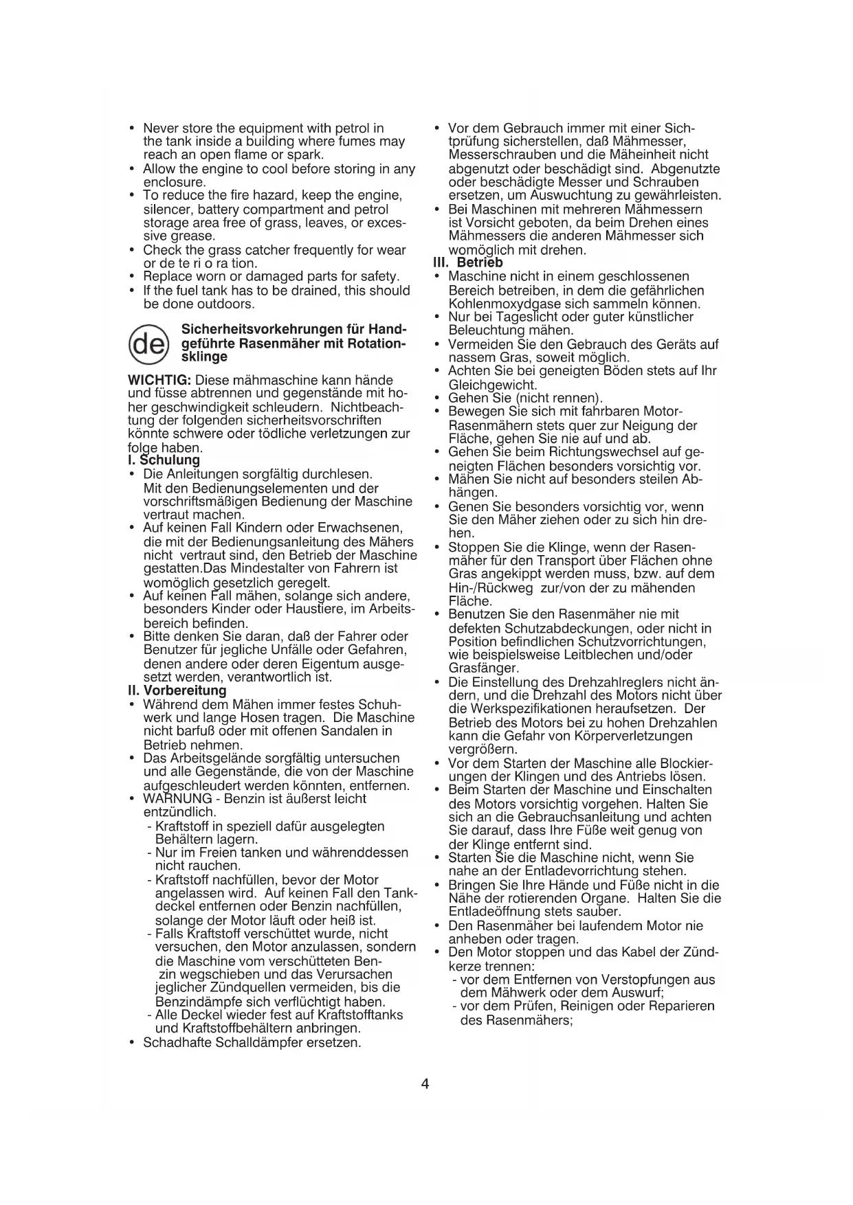 - If the fuel tank has to be drained, this should be done outdoors. Sicherheitsvorkehrungen für Hand- geführte Rasenmäher mit Rotation- sklinge WICHTIG: Diese mähmaschine kann hände und füsse abtrennen und gegenstände mit ho- her geschwindigkeit schleudern. Nichtbeach- tung der folgenden sicherheitsvorschriften könnte schwere oder tödliche verletzungen zur folge haben.