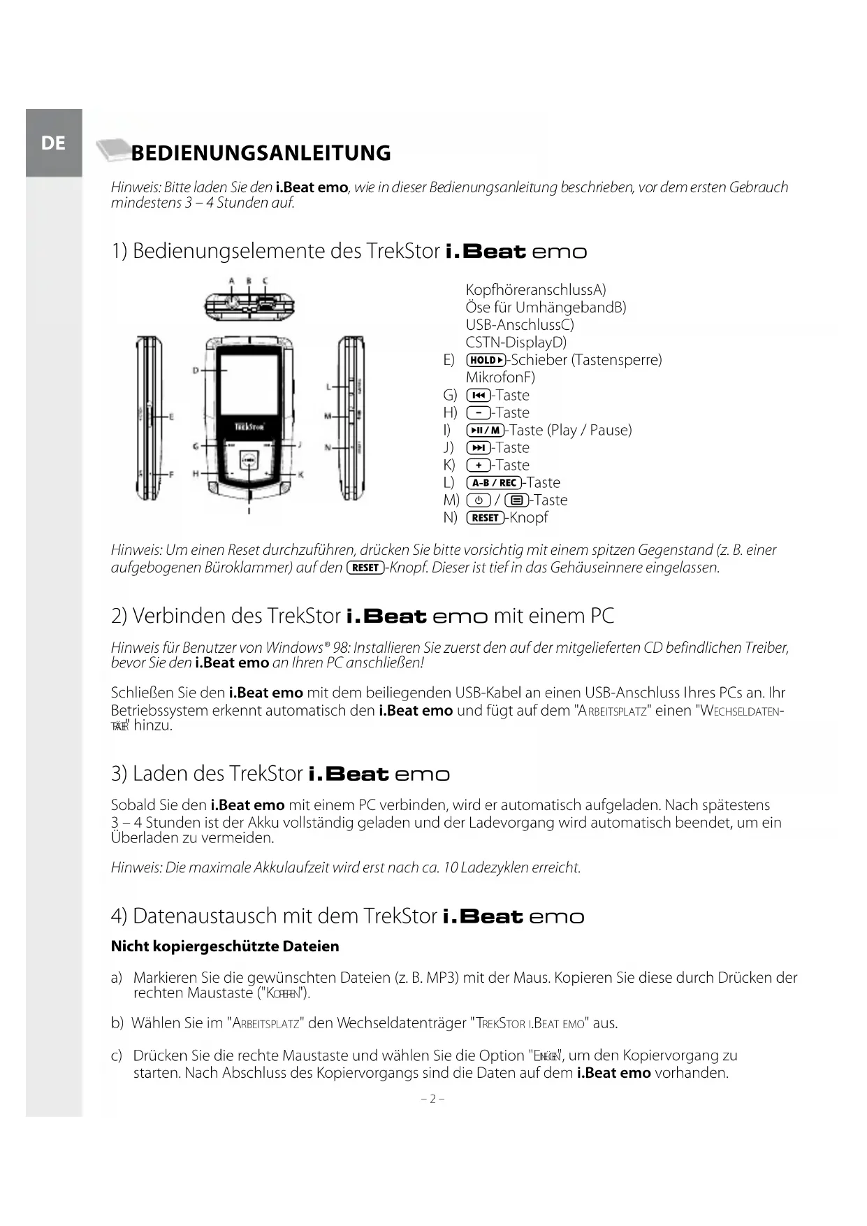 – 3 – BEDIENUNGSANLEITUNG Hinweis: Bitte laden Sie den i.Beat emo, wie in dieser Bedienungsanleitung beschrieben, vor dem ersten Gebrauch mindestens 3 – 4 Stunden auf.