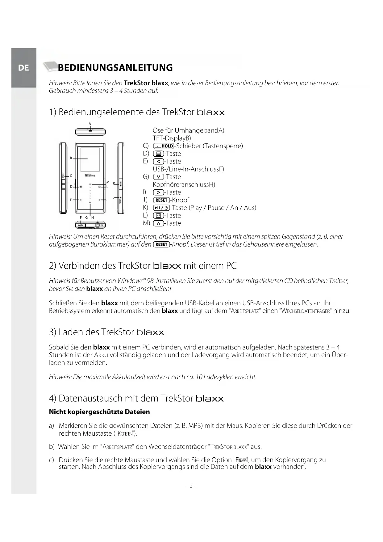 – 3 – BEDIENUNGSANLEITUNG Hinweis: Bitte laden Sie den TrekStor blaxx, wie in dieser Bedienungsanleitung beschrieben, vor dem ersten Gebrauch mindestens 3 – 4 Stunden auf.