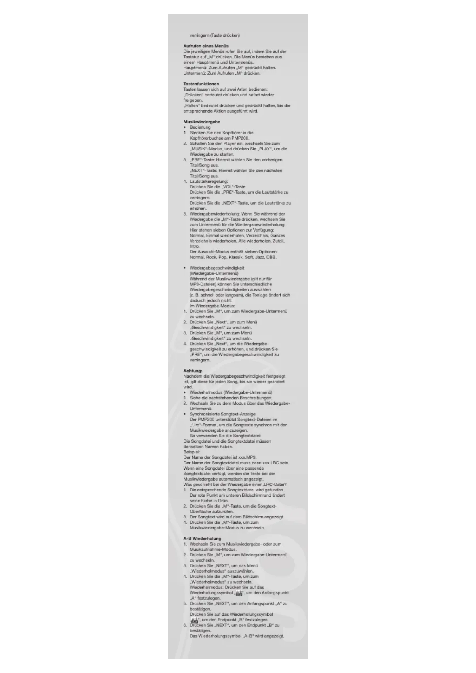 geschwindigkeit zu erhöhen, und drücken Sie „PRE“, um die Wiedergabegeschwindigkeit zu verringern. Achtung: Nachdem die Wiedergabegeschwindigkeit festgelegt ist, gilt diese für jeden Song, bis sie wieder geändert wird.