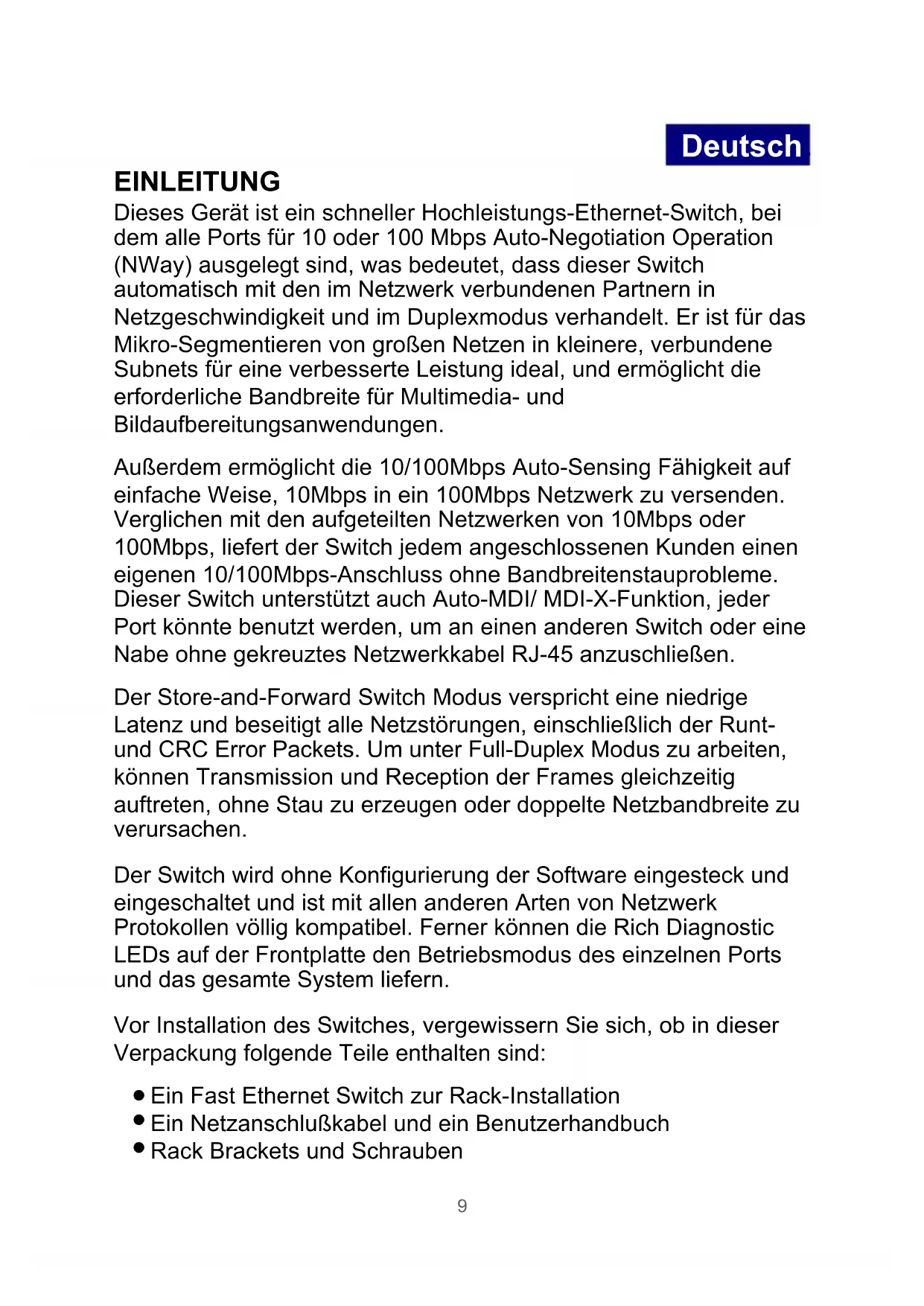 8Deutsch. EINLEITUNG Dieses Gerät ist ein schneller Hochleistungs-Ethernet-Switch, bei dem alle Ports für 10 oder 100 Mbps Auto-Negotiation Operation (NWay) ausgelegt sind, was bedeutet, dass dieser Switch automatisch mit den im Netzwerk verbundenen Partnern in Netzgeschwindigkeit und im Duplexmodus verhandelt. Er ist für das Mikro-Segmentieren von großen Netzen in kleinere, verbundene Subnets für eine verbesserte Leistung ideal, und ermöglicht die erforderliche Bandbreite für Multimedia- und Bildaufbereitungsanwendungen. Außerdem ermöglicht die 10/100Mbps Auto-Sensing Fähigkeit auf einfache Weise, 10Mbps in ein 100Mbps Netzwerk zu versenden. Verglichen mit den aufgeteilten Netzwerken von 10Mbps oder 100Mbps, liefert der Switch jedem angeschlossenen Kunden einen eigenen 10/100Mbps-Anschluss ohne Bandbreitenstauprobleme. Dieser Switch unterstützt auch Auto-MDI/ MDI-X-Funktion, jeder Port könnte benutzt werden, um an einen anderen Switch oder eine Nabe ohne gekreuztes Netzwerkkabel RJ-45 anzuschließen. Der Store-and-Forward Switch Modus verspricht eine niedrige Latenz und beseitigt alle Netzstörungen, einschließlich der Runt- und CRC Error Packets. Um unter Full-Duplex Modus zu arbeiten, können Transmission und Reception der Frames gleichzeitig auftreten, ohne Stau zu erzeugen oder doppelte Netzbandbreite zu verursachen. Der Switch wird ohne Konfigurierung der Software eingesteck und eingeschaltet und ist mit allen anderen Arten von Netzwerk Protokollen völlig kompatibel. Ferner können die Rich Diagnostic LEDs auf der Frontplatte den Betriebsmodus des einzelnen Ports und das gesamte System liefern. Vor Installation des Switches, vergewissern Sie sich, ob in dieser Verpackung folgende Teile enthalten sind: