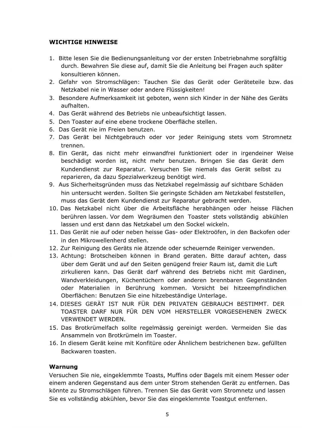 5. Den Toaster auf eine ebene trockene Oberfläche stellen.