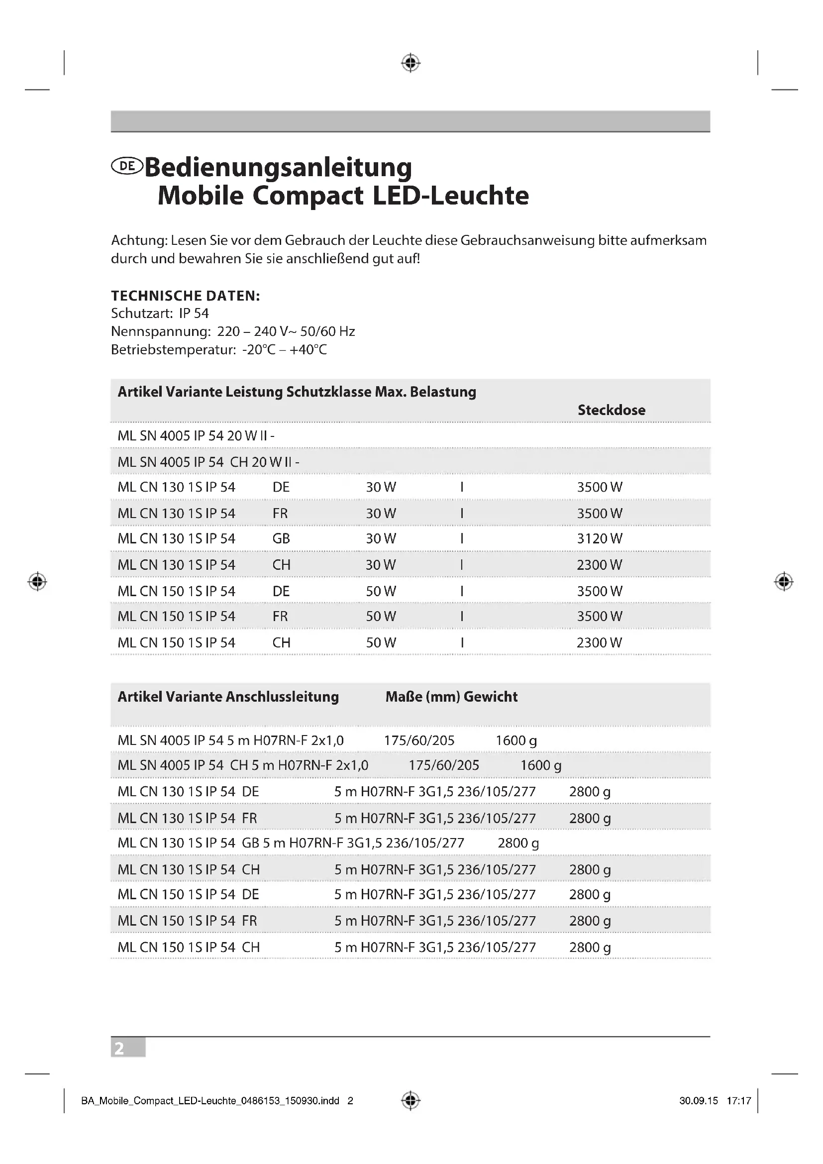 Bedienungsanleitung Mobile Compact LED-Leuchte Achtung: Lesen Sie vor dem Gebrauch der Leuchte diese Gebrauchsanweisung bitte aufmerksam durch und bewahren Sie sie anschließend gut auf! TECHNISCHE DATEN: Schutzart: IP 54 Nennspannung: 220 – 240 V~ 50/60 Hz Betriebstemperatur: -20°C – +40°C Artikel Variante Leistung Schutzklasse Max. Belastung Steckdose ML SN 4005 IP 54 20 W II - ML SN 4005 IP 54 CH 20 W II - ML CN 130 1S IP 54 DE 30 W I 3500 W ML CN 130 1S IP 54 FR 30 W I 3500 W ML CN 130 1S IP 54 GB 30 W I 3120 W ML CN 130 1S IP 54 CH 30 W I 2300 W ML CN 150 1S IP 54 DE 50 W I 3500 W ML CN 150 1S IP 54 FR 50 W I 3500 W ML CN 150 1S IP 54 CH 50 W I 2300 W Artikel Variante Anschlussleitung Maße (mm) Gewicht ML SN 4005 IP 54 5 m H07RN-F 2x1,0 175/60/205 1600 g ML SN 4005 IP 54 CH 5 m H07RN-F 2x1,0 175/60/205 1600 g ML CN 130 1S IP 54 DE 5 m H07RN-F 3G1,5 236/105/277 2800 g ML CN 130 1S IP 54 FR 5 m H07RN-F 3G1,5 236/105/277 2800 g ML CN 130 1S IP 54 GB 5 m H07RN-F 3G1,5 236/105/277 2800 g ML CN 130 1S IP 54 CH 5 m H07RN-F 3G1,5 236/105/277 2800 g ML CN 150 1S IP 54 DE 5 m H07RN-F 3G1,5 236/105/277 2800 g ML CN 150 1S IP 54 FR 5 m H07RN-F 3G1,5 236/105/277 2800 g ML CN 150 1S IP 54 CH 5 m H07RN-F 3G1,5 236/105/277 2800 g BA_Mobile_Compact_LED-Leuchte_0486153_150930.indd 2 30.09.15 17:173