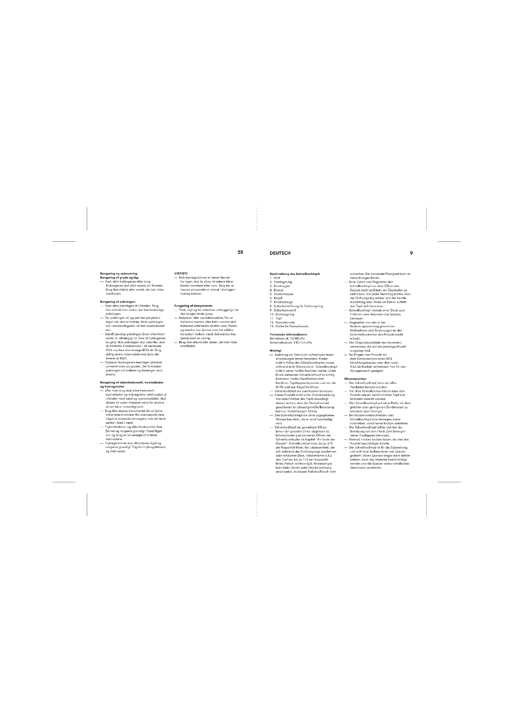 DEUTSCH Rengøring og opbevaring: Rengøring af gryde og låg: — Vask altid trykkogeren efter brug. Trykkogeren skal altid vaskes af i hånden. Brug ikke ståluld eller andet, der kan ridse overfladen. Rengøring af pakningen: — Vask altid pakningen af i hånden. Brug ikke ståluld eller andet, der kan beskadige pakningen. — Tør pakningen af, og sæt den på plads i låget, når den er helt tør. Gnid pakningen ind i madlavningsolie, så den bedre holder tæt. — Udskift jævnligt pakningen (hvert eller hvert andet år, afhængigt af, hvor tit trykkogeren bruges). Hvis pakningen skal udskiftes, skal du kontakte Kundeservice i dit nærmeste IKEA varehus eller besøge IKEA.dk. Brug aldrig andre reservedele end dem, der leveres af IKEA. — Opbevar trykkogeren med låget placeret omvendt oven på gryden. Det forhindrer pakningen i at udtørre og forlænger dens levetid. Rengøring af sikkerhedsventil, trykindikator og trykregulator: — Efter hver brug skal sikkerhedsventil, trykindikator og trykregulator altid vaskes af i hånden med vand og opvaskemiddel. Skyl delene af under rindende vand for at sikre, at det bliver ordentligt rent. — Brug ikke skarpe instrumenter for at fjerne indtørrede madvarer fra ovennævnte dele. Låget er nemmere at rengøre, hvis det først sættes i blød i vand. — Trykindikatoren og sikkerhedsventilen kan fjernes og rengøres grundigt. Vend låget om, og brug en skruenøgle til at løsne møtrikkerne. — Trykregulatoren kan afmonteres låget og rengøres grundigt. Tag fat i trykregulatoren, og træk opad. VIGTIGT! — Hvis trykregulatoren er blevet fjernet fra låget, skal du sikre, at delene bliver korrekt monteret efter vask. Sørg for, at tappen på panelet er indsat i åbningen i trykregulatoren. Rengøring af dampindsats — Vask, skyl og tør indsatsen omhyggeligt, før den bruges første gang. — Indsatsen tåler opvaskemaskine. For at forhindre mærker efter kalk i vandet skal indsatsen altid tørres af efter vask. Pletter og mærker kan fjernes med lidt eddike fortyndet i lunkent vand. Saltmærker kan fjernes med en svamp. — Brug ikke ståluld eller andet, der kan ridse overfladen.— Bei Verwendung auf dem Gasherd darauf achten, dass die Flammen die Griffe nicht erreichen. Vor der ersten Benutzung: — Gebrauchsanleitung komplett durchlesen. — Schnellkochtopf zur Hälfte mit Wasser füllen und dann den Deckel gem. der Anleitung unten schließen. Den Schnellkochtopf auf ein Kochfeld stellen und erhitzen, bis aus dem Druckregler Dampf entweicht (3). Dies entfernt alle fertigungsbedingten Rückstände, die sich eventuell noch im Schnellkochtopf befinden. — Hitzezufuhr ausschalten und den Schnellkochtopf vorsichtig vom Kochfeld nehmen. Sobald der Topf abgekühlt ist, Topf und Deckel mit Wasser und Spülmittel von Hand spülen. Vor jeder Benutzung: — Sicherstellen, dass alle Ventile sauber sind und sich ungehindert bewegen können. Außerdem muss der Dichtungsring korrekt im Deckel eingelegt werden. — Darauf achten, dass sich die erforderliche Flüssigkeitsmenge im Schnellkochtopf befindet. Zur Verwendung des Schnellkochtopfs: — Schnellkochtopf zu mindestens 1/4 (untere Markierung im Topf) oder maximal 2/3 seiner Kapazität (obere Markierung) befüllen. Beim Garen von Speisen, die sich während des Kochvorgangs ausdehnen oder schäumen, Schnellkochtopf nur bis zu 1/3 seiner Kapazität befüllen. Durch ein Überfüllen des Schnellkochtopfs kann er überkochen, was zur Verstopfung der Ventile führen kann. — Deckel auf den Schnellkochtopf setzen und Knopf im Uhrzeigersinn drehen. Darauf achten, dass der Deckel sicher auf den Topf passt. Der Deckel ist korrekt positioniert, wenn Topfgriff und Abdeckkappe sich in einer Linie befinden. — Schnellkochtopf auf hoher Hitzestufe erhitzen bis ein gleichmäßiger Dampfstrahl aus dem Druckregler strömt (3). Die empfohlene Garzeit, die in der beiliegenden Tabelle angegeben ist, ist ab dem Beginn des Ausströmens von Dampf aus dem Druckregler berechnet. Temperatur anpassen und Speise entsprechend der Garzeittabelle garen. Während des Druckaufbaus im Schnellkochtopf ist es normal, dass Dampf unter der Abdeckkappe auf dem Deckel entweicht. — Um Überdruck zu verhindern, ist der Schnellkochtopf mit einem Sicherheitsventil ausgestattet (9). Baut das Sicherheitsventil (z.B. durch Verstopfung) den Druck nicht ab, so befindet sich im Deckelrand ein weiteres Sicherheitselement. Im Fall von Hochdruckaufbau wird der Dichtungsring durch die Sicherheitsöffnung für den Dichtungsring im Deckel gedrückt und der Dampf kann entweichen. Daher sollte der Schnellkochtopf beim Benutzen immer so positioniert werden, dass die Sicherheitsöffnung für den Dichtungsring (8) vom Benutzer weggerichtet ist. Am Ende der Garzeit: Der Deckel kann geöffnet werden, wenn der Innendruck vollständig abgebaut wurde und die Druckanzeige (7) sich komplett abgesenkt hat. Dies kann auf zwei Arten geschehen: