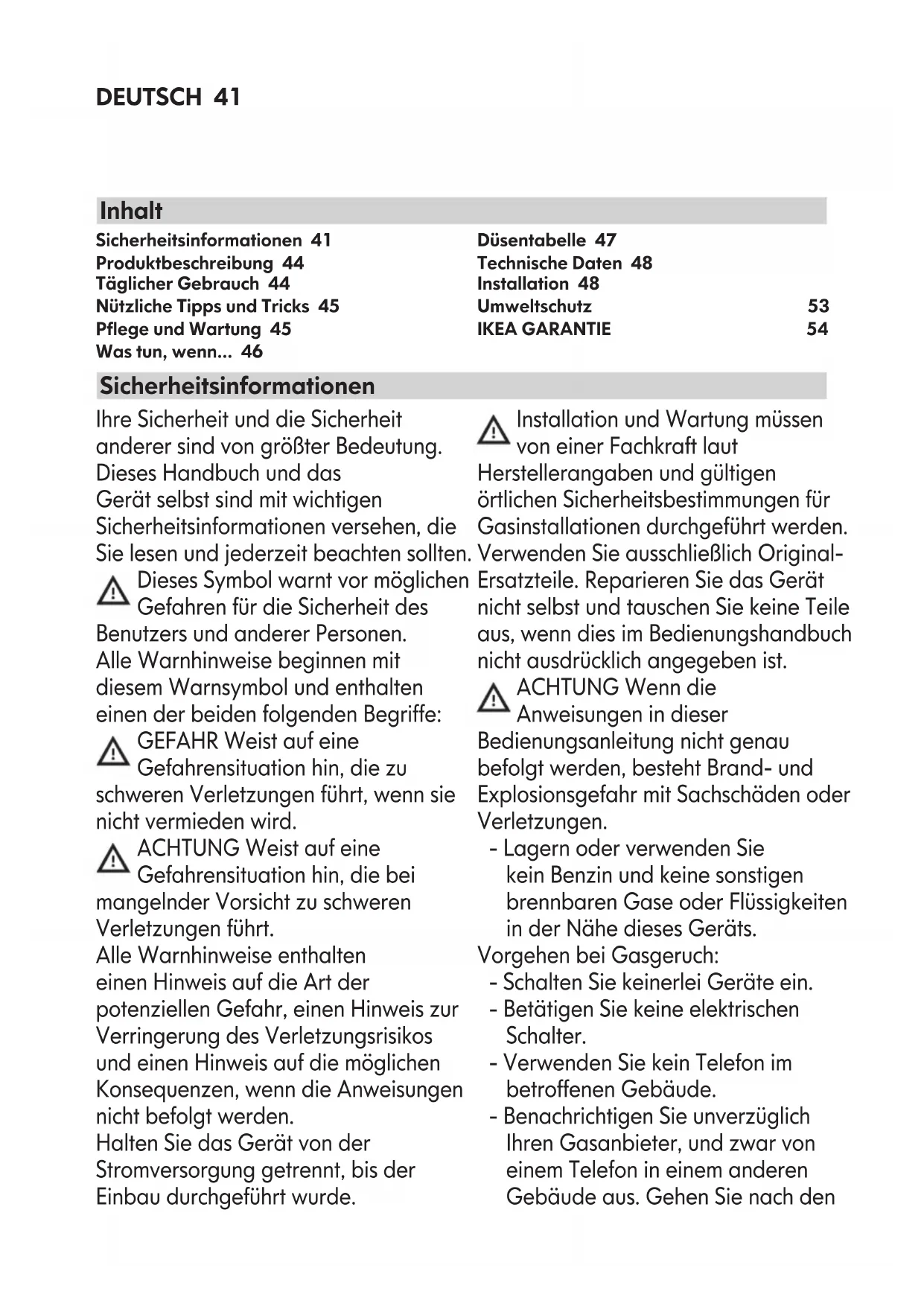 D’ACHAT ! La preuve de votre achat est nécessaire pour l’application de la garantie. Le nom et le numéro d’article (code à 8 chiffres) IKEA de chaque appareil acheté gurent également sur la preuve d’achat. Besoin d’une assistance supplémentaire ? Pour toute autre questions en dehors du service après-vente de vos appareils, contactez le call center de votre magasin IKEA. Nous vous recommandons de lire attentivement toute la documentation fournie avec l’appareil avant de nous contacter. Consultez la dernière page de ce manuel pour la liste complète des services Après-vente agréés IKEA avec leur numéro de téléphone respectifs.DEUTSCH 41 Ihre Sicherheit und die Sicherheit anderer sind von größter Bedeutung. Dieses Handbuch und das Gerät selbst sind mit wichtigen Sicherheitsinformationen versehen, die Sie lesen und jederzeit beachten sollten. Dieses Symbol warnt vor möglichen Gefahren für die Sicherheit des Benutzers und anderer Personen. Alle Warnhinweise beginnen mit diesem Warnsymbol und enthalten einen der beiden folgenden Begriffe: GEFAHR Weist auf eine Gefahrensituation hin, die zu schweren Verletzungen führt, wenn sie nicht vermieden wird. ACHTUNG Weist auf eine Gefahrensituation hin, die bei mangelnder Vorsicht zu schweren Verletzungen führt. Alle Warnhinweise enthalten einen Hinweis auf die Art der potenziellen Gefahr, einen Hinweis zur Verringerung des Verletzungsrisikos und einen Hinweis auf die möglichen Konsequenzen, wenn die Anweisungen nicht befolgt werden. Halten Sie das Gerät von der Stromversorgung getrennt, bis der Einbau durchgeführt wurde. Installation und Wartung müssen von einer Fachkraft laut Herstellerangaben und gültigen örtlichen Sicherheitsbestimmungen für Gasinstallationen durchgeführt werden. Verwenden Sie ausschließlich Original- Ersatzteile. Reparieren Sie das Gerät nicht selbst und tauschen Sie keine Teile aus, wenn dies im Bedienungshandbuch nicht ausdrücklich angegeben ist. ACHTUNG Wenn die Anweisungen in dieser Bedienungsanleitung nicht genau befolgt werden, besteht Brand- und Explosionsgefahr mit Sachschäden oder Verletzungen. - Lagern oder verwenden Sie kein Benzin und keine sonstigen brennbaren Gase oder Flüssigkeiten in der Nähe dieses Geräts. Vorgehen bei Gasgeruch: - Schalten Sie keinerlei Geräte ein. - Betätigen Sie keine elektrischen Schalter. - Verwenden Sie kein Telefon im betroffenen Gebäude. - Benachrichtigen Sie unverzüglich Ihren Gasanbieter, und zwar von einem Telefon in einem anderen Gebäude aus. Gehen Sie nach den Sicherheitsinformationen 41 Produktbeschreibung 44 Täglicher Gebrauch 44 Nützliche Tipps und Tricks 45 Pege und Wartung 45 Was tun, wenn... 46 Düsentabelle 47 Technische Daten 48 Installation 48 Umweltschutz 53 IKEA GARANTIE 54 Sicherheitsinformationen InhaltDEUTSCH 42 Anweisungen des Gasanbieters vor. - Wenn der Gasanbieter nicht erreichbar ist, rufen Sie die Feuerwehr. - Installation und Wartung müssen von einer Fachkraft, einem Wartungsunternehmen oder dem Gasanbieter ausgeführt werden. - Das Gerät darf nur in gut belüfteten Räumen betrieben werden. - Die elektrischen Anschlüsse und die Gasanschlüsse müssen den örtlichen Bestimmungen entsprechen. - Bei der Installation des Kochfeldes muss ein mehrpoliger Trennschalter mit einer Kontaktöffnung von mindestens 3 mm verwendet werden, der für eine vollständige Trennung sorgt. - Die Erdung des Gerätes ist gesetzlich vorgeschrieben. - Das Netzkabel muss lang genug sein, um das Gerät nach der Montage im Küchenmöbel an die Stromversorgung anzuschließen. - Für den Gasanschluss dürfen ausschließlich exible oder starre Metallschläuche verwendet werden. - Falls nötig, darf das Stromkabel nur durch ein Kabel mit identischen Dimensionen und Eigenschaften wie das Originalkabel ersetzt werden (Typ H05V2V2-F 90°C oder Typ H05RR-F). Diese Arbeit darf nur von einem qualizierten Elektriker durchgeführt werden. - Der Hersteller haftet nicht für etwaige durch Missachtung dieser Vorschriften entstandene Verletzungen von Personen und Tieren oder Sachschäden. - Verwenden Sie keine Mehrfachstecker oder Verlängerungskabel. - Ziehen Sie nicht am Netzkabel des Gerätes, um den Stecker aus der Steckdose zu ziehen. - Nach der Installation dürfen Strom führende Teile für den Benutzer nicht mehr zugänglich sein. - Berühren Sie das Gerät nicht mit feuchten Händen und benutzen Sie es nicht, wenn Sie barfuß sind. - Dieses Kochfeld (Klasse 3) ist ausschließlich für die Verwendung im Haushalt zum Kochen von Lebensmitteln bestimmt. Das Gerät darf AUF KEINEN FALL als Heizgerät zum Heizen oder Erwärmen des Raums verwendet werden. Andernfalls besteht die Gefahr einer Kohlenmonoxidvergiftung und einer Überhitzung des Kochfeldes. - Der Hersteller haftet nicht bei Schäden aufgrund unsachgemäßen Gebrauchs oder fehlerhafter Bedienung. - Das Gerät und die zugänglichen Teile werden bei der Benutzung heiß. Vermeiden Sie unbedingt das Berühren der Heizelemente. Kinder unter 8 Jahren dürfen das Gerät nur unter ständiger Überwachung bedienen. Dieses Gerät darf von Kindern unter und über 8 Jahren und von Personen, derenDEUTSCH 43 physische, sensorische oder geistige Fähigkeiten und deren Mangel an Erfahrung und Kenntnissen einen sicheren Gebrauch des Gerätes ausschließen nur unter Aufsicht oder nach ausreichender Einweisung durch eine verantwortungsbewusste Person benutzt werden, die sicherstellt, dass sie sich der Gefahren des Gebrauchs bewusst sind. Lassen Sie Kinder nicht mit dem Gerät spielen. - Der Betrieb eines Gasgeräts erzeugt Hitze und Feuchtigkeit im Raum. Achten Sie unbedingt auf eine gute Raumbelüftung oder installieren Sie eine Abzugshaube mit Abzug ins Freie. - Halten Sie Haustiere von dem Gerät fern. - Bei längerer Benutzung kann eine zusätzliche Belüftung erforderlich werden (Öffnen eines Fensters oder Erhöhung der Absaugleistung der Abzugshaube). - Vergewissern Sie sich nach dem Gebrauch, dass 