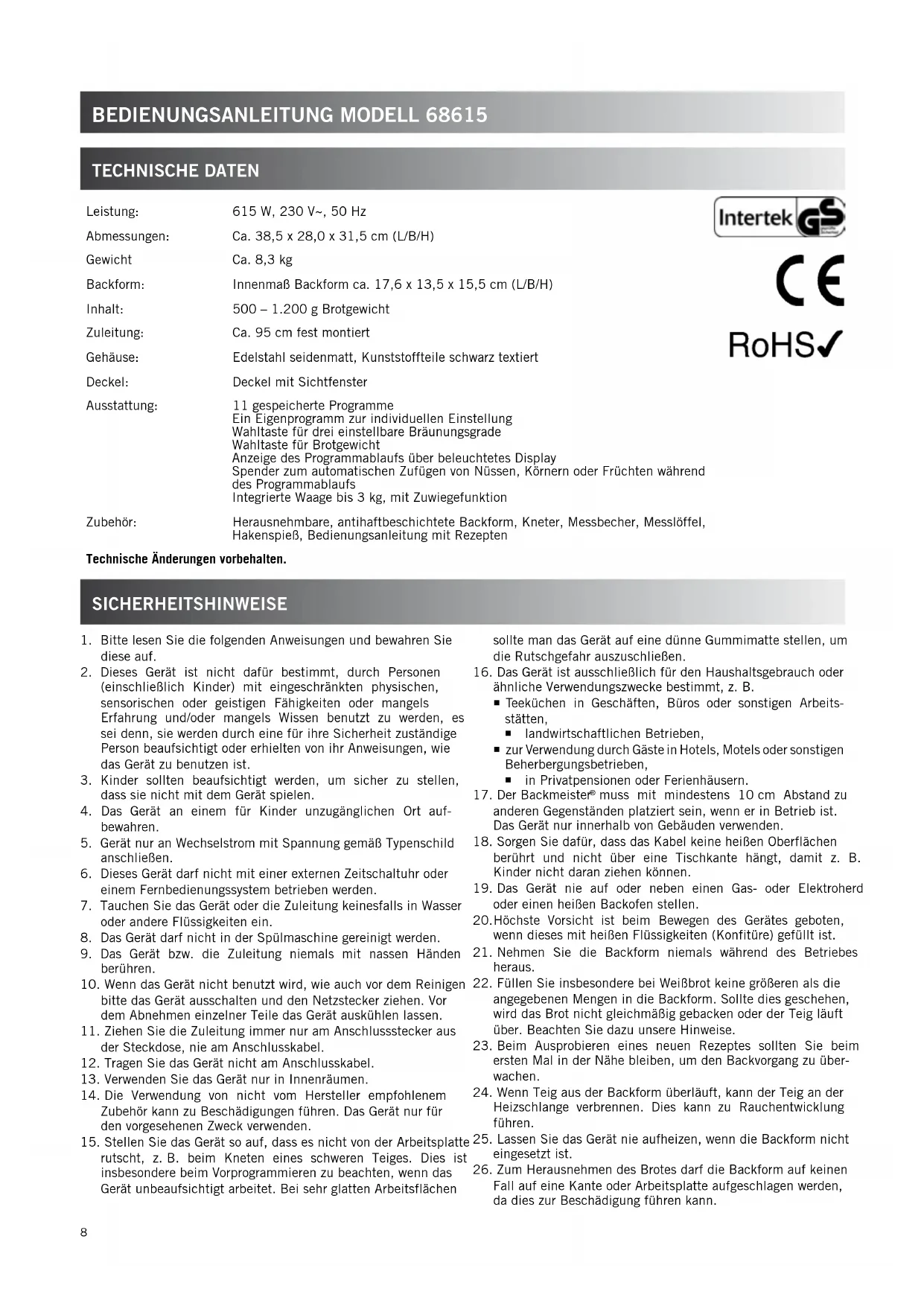 Konfitüre in Gläser füllen und diese gut verschließen. Erdbeer-Konfitüre Frische Erdbeeren gewaschen, geputzt und klein geschnitten oder püriert 600 g Gelierzucker „2:1“ 400 g Zitronensaft 1-2 TL Alle Zutaten im Behälter mit einem Gummischaber ver- mischen. Programm „KONFITÜRE“ wählen und starten. Von den Seitenwänden des Behälters Zuckerreste mit einem Spatel abstreifen. Wenn das Signal ertönt die Backform mit Topflappen aus dem Gerät nehmen. Die Konfitüre in Gläser abfüllen und diese gut verschließen. Programm: KONFITÜRE Orangenmarmelade Orangen geschält und klein gewürfelt 600 g Zitronen geschält und klein gewürfelt 50 g Gelierzucker „2:1“ 400 g Orangen und Zitronen schälen und in Stückchen schneiden. Zucker beifügen und alle Zutaten im Behälter vermischen. Programm KONFITÜRE wählen und starten. Mit einem Gummispatel Zuckerreste von den Seiten des Behälters abstreifen. Wenn das Signal ertönt, die Backform mit Topf lappen aus dem Gerät nehmen. Die Marmelade in Gläser abfüllen und diese gut verschließen. Programm: KONFITÜRE30 instructions for use model 68615 safety information technical specifications