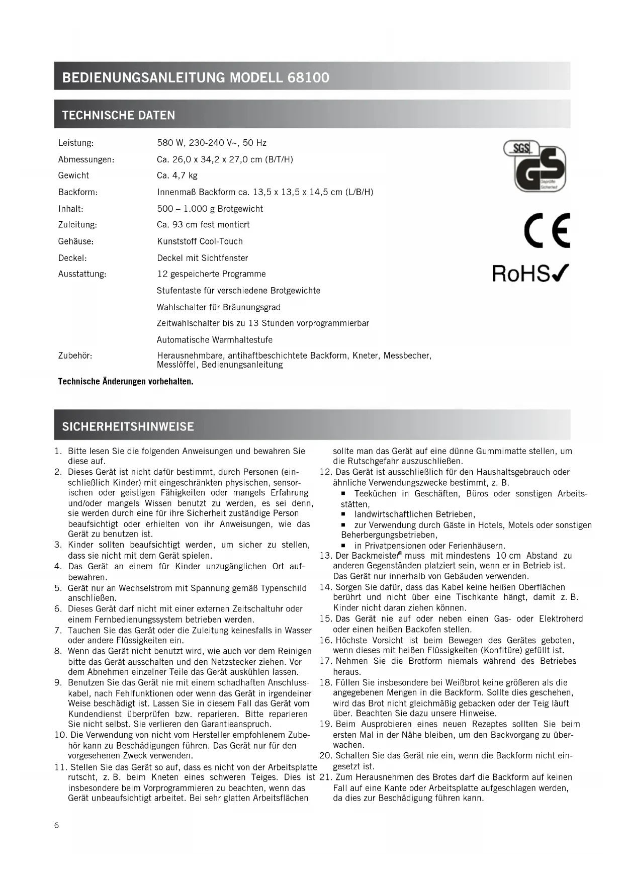 Fall auf eine Kante oder Arbeitsplatte aufgeschlagen werden, da dies zur Beschädigung führen kann. Leistung: 580 W, 230-240 V~, 50 Hz Abmessungen: Ca. 26,0 x 34,2 x 27,0 cm (B/T/H) Gewicht Ca. 4,7 kg Backform: Innenmaß Backform ca. 13,5 x 13,5 x 14,5 cm (L/B/H) Inhalt: 500 – 1.000 g Brotgewicht Zuleitung: Ca. 93 cm fest montiert Gehäuse: Kunststoff Cool-Touch Deckel: Deckel mit Sichtfenster Ausstattung: 12 gespeicherte Programme Stufentaste für verschiedene Brotgewichte Wahlschalter für Bräunungsgrad Zeitwahlschalter bis zu 13 Stunden vorprogrammierbar Automatische Warmhaltestufe Zubehör: Herausnehmbare, antihaftbeschichtete Backform, Kneter, Messbecher, Messlöffel, Bedienungsanleitung Technische Änderungen vorbehalten.7
