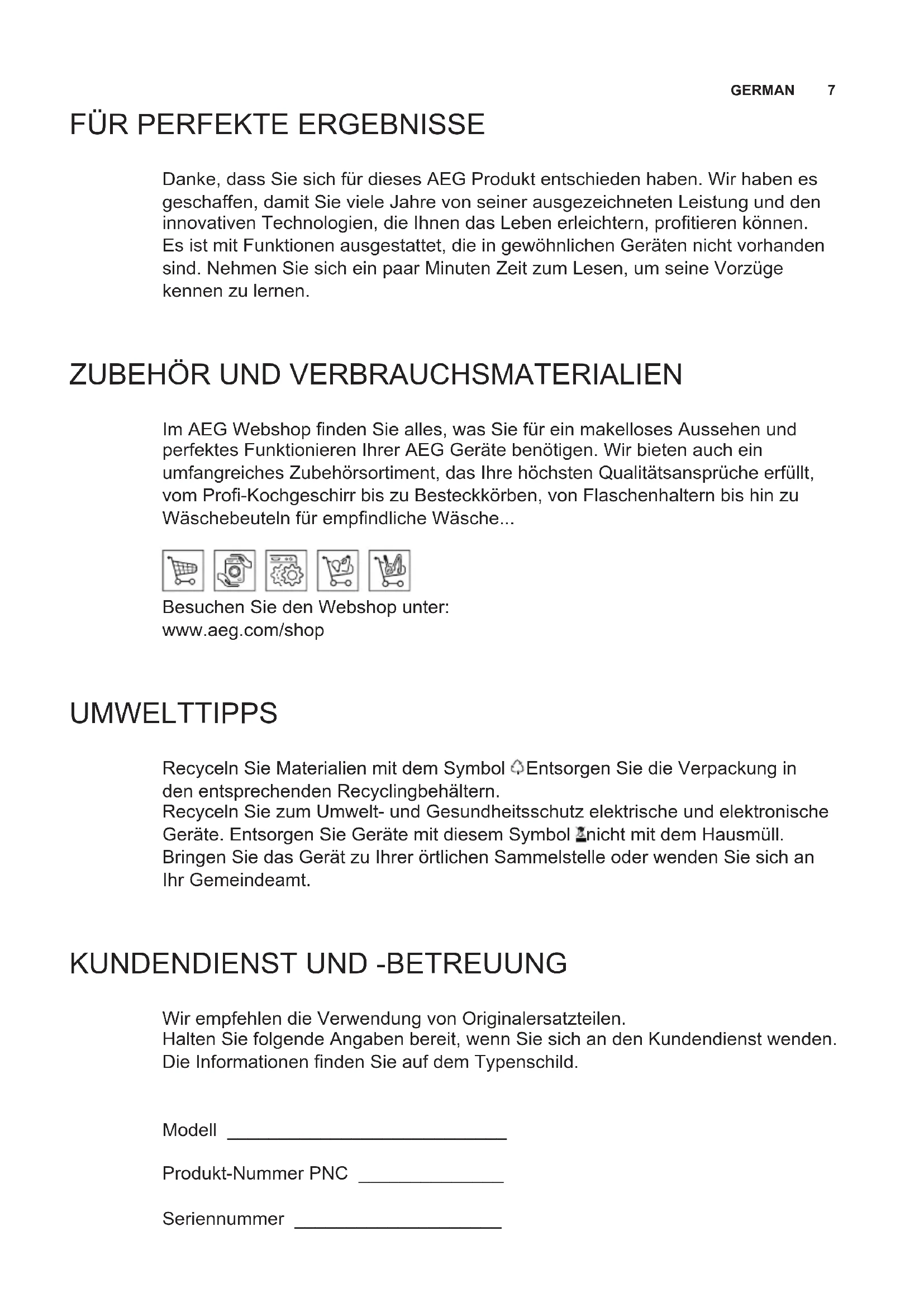Wir empfehlen die Verwendung von Originalersatzteilen. Halten Sie folgende Angaben bereit, wenn Sie sich an den Kundendienst wenden. Die Informationen nden Sie auf dem Typenschild. Modell ___________________________ Produkt-Nummer PNC ______________ Seriennummer ____________________8 EMPFEHLUNGEN UND HINWEISE