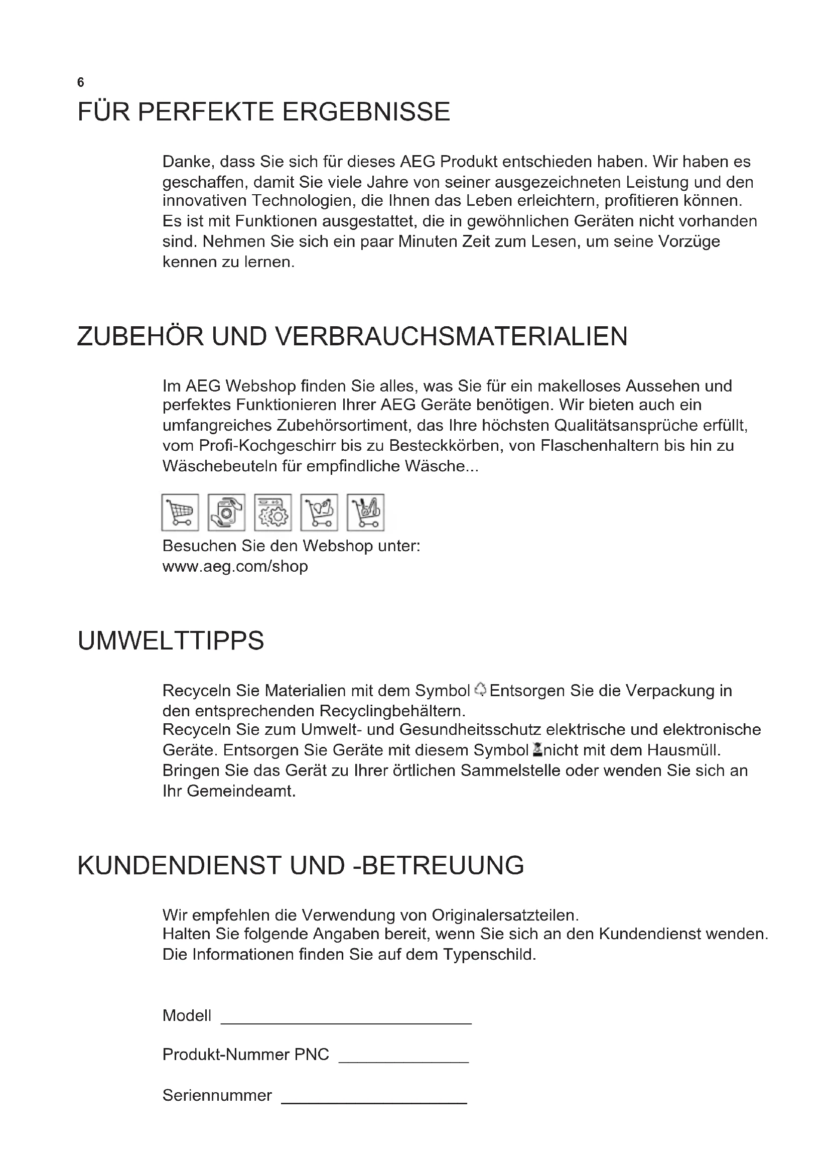 Im AEG Webshop nden Sie alles, was Sie für ein makelloses Aussehen und perfektes Funktionieren Ihrer AEG Geräte benötigen. Wir bieten auch ein umfangreiches Zubehörsortiment, das Ihre höchsten Qualitätsansprüche erfüllt, vom Pro-Kochgeschirr bis zu Besteckkörben, von Flaschenhaltern bis hin zu Wäschebeuteln für empndliche Wäsche... Besuchen Sie den Webshop unter: www.aeg.com/shop UMWELTTIPPS Recyceln Sie Materialien mit dem Symbol . Entsorgen Sie die Verpackung in den entsprechenden Recyclingbehältern. Recyceln Sie zum Umwelt- und Gesundheitsschutz elektrische und elektronische Geräte. Entsorgen Sie Geräte mit diesem Symbol nicht mit dem Hausmüll. Bringen Sie das Gerät zu Ihrer örtlichen Sammelstelle oder wenden Sie sich an Ihr Gemeindeamt.