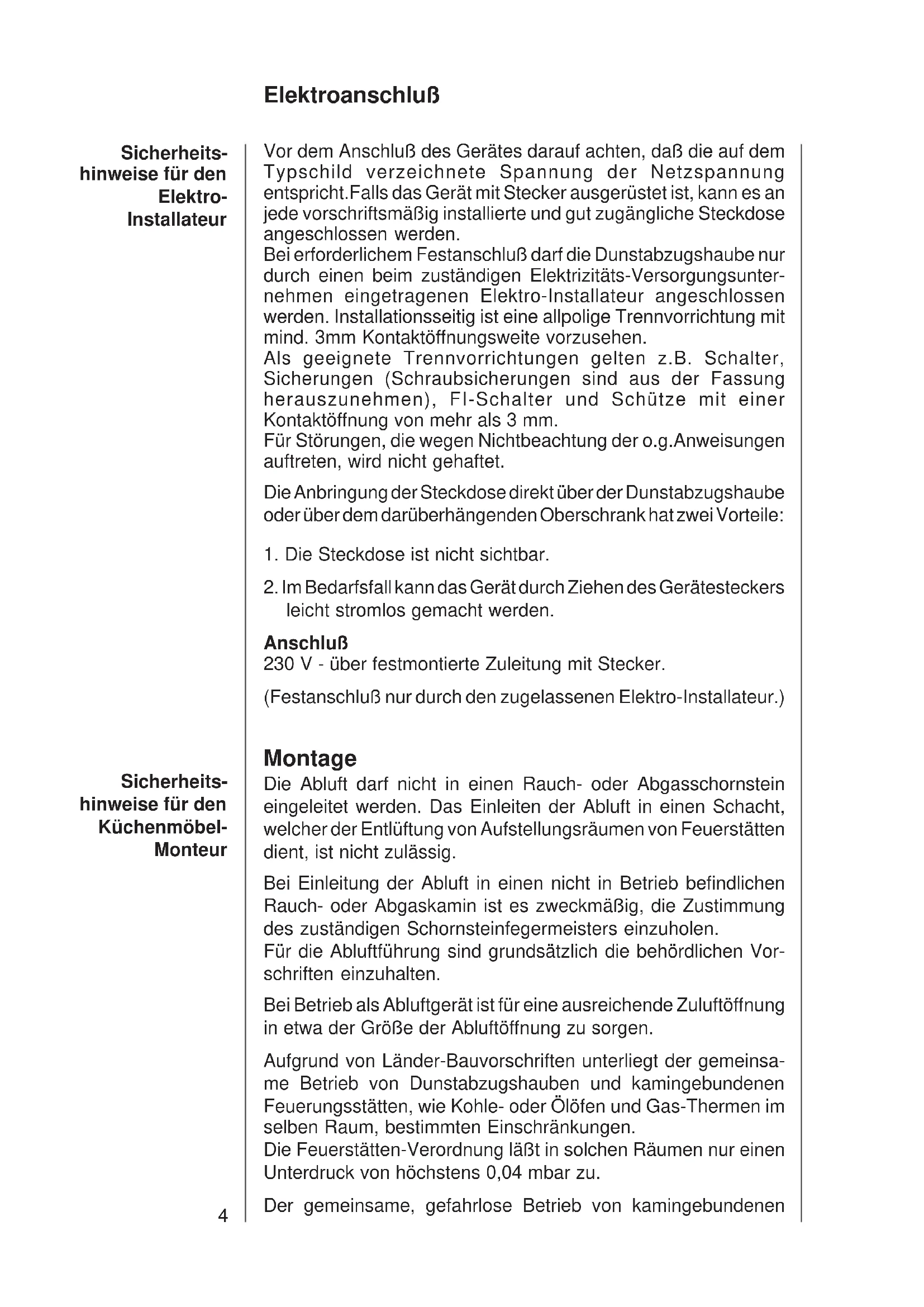 Bei erforderlichem Festanschluß darf die Dunstabzugshaube nur durch einen beim zuständigen Elektrizitäts-Versorgungsunternehmen eingetragenen Elektro-Installateur angeschlossen werden. Installationsseitig ist eine allpolige Trennvorrichtung mit mind. 3mm Kontaktöffnungsweite vorzusehen.