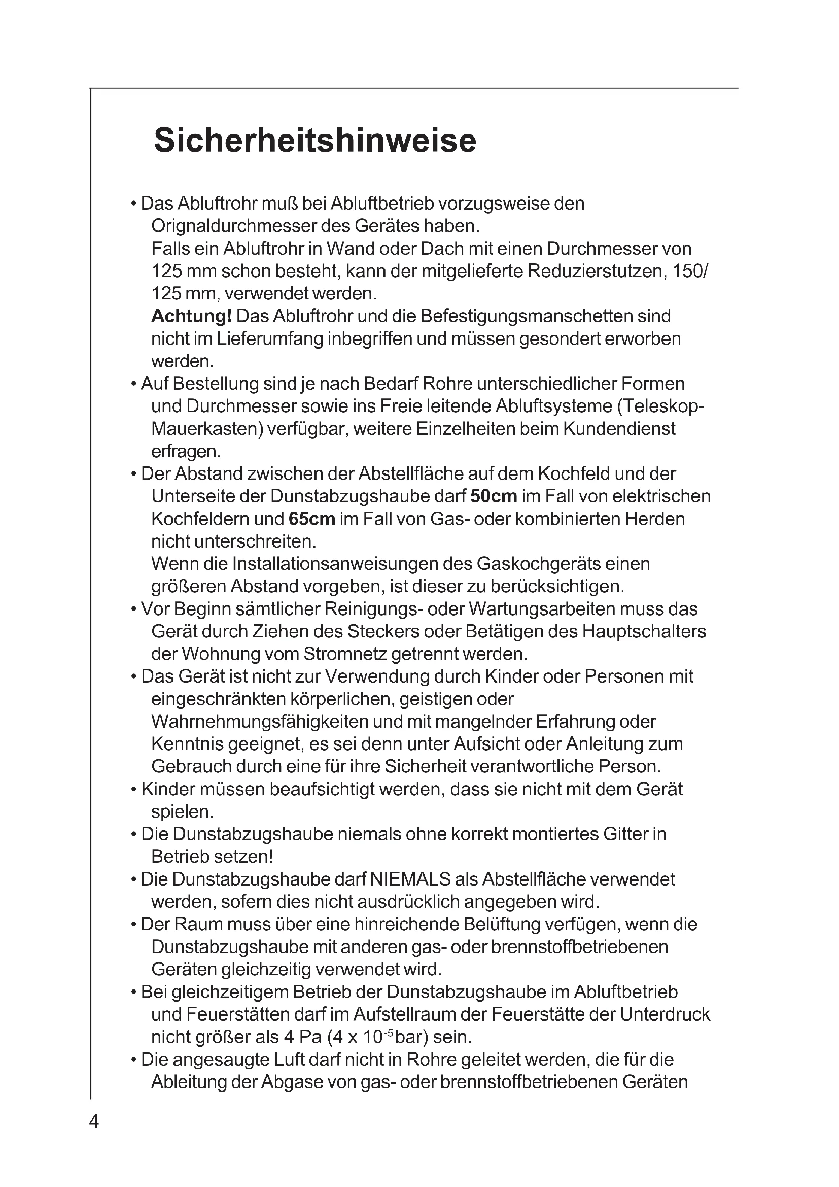 - Bei gleichzeitigem Betrieb der Dunstabzugshaube im Abluftbetrieb und Feuerstätten darf im Aufstellraum der Feuerstätte der Unterdruck nicht länger als 4 Pa (4 x 10 ^-5 bar) sein.