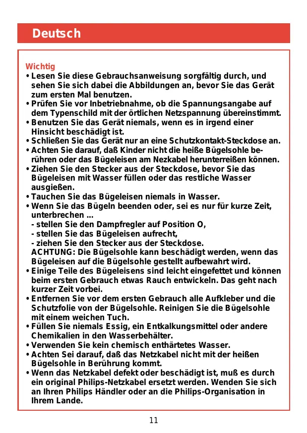 - Wenn das Netzkabel defekt oder beschädigt ist, muß es durch ein original Philips-Netzkabel ersetzt werden. Wenden Sie sich an Ihren Philips Händler oder an die Philips-Organisation in Ihrem Lande.