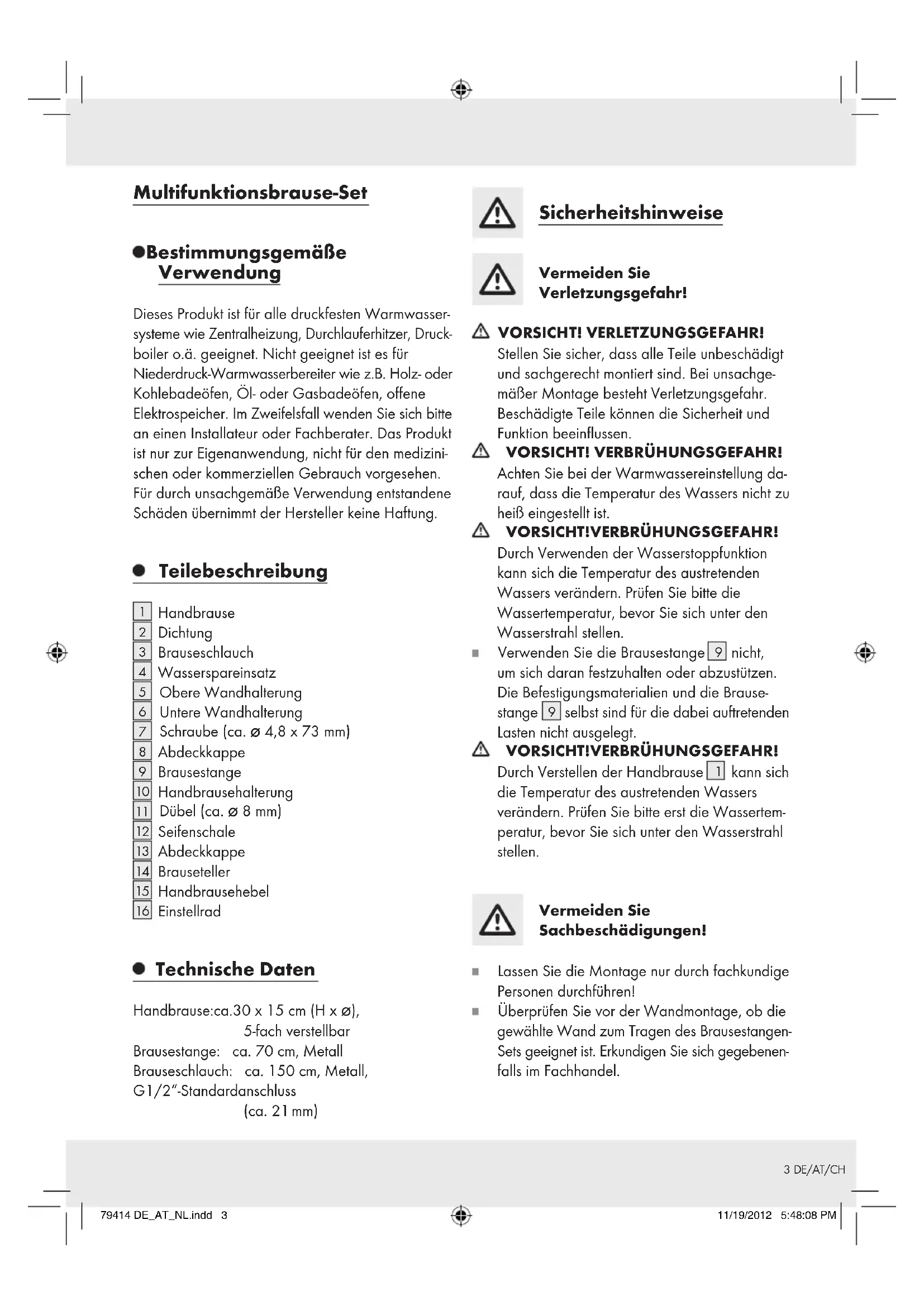 Z29601 79414 CB1 cover.indd 4 11/15/2012 12:39:03 PMDE / AT / CH Montage- und Sicherheitshinweise Seite 3 FR / CH Instructions de montage et consignes de sécurité Page 6 IT / CH Istruzioni di sicurezza e montaggio Pagina 9 NL Montage- en veiligheidsinstructies Pagina 12 79414 CB1 cover.indd 5 11/15/2012 12:39:03 PM3 DE/AT/CH Multifunktionsbrause-Set Bestimmungsgemäße Verwendung Dieses Produkt ist für alle druckfesten Warmwasser- systeme wie Zentralheizung, Durchlauferhitzer, Druck- boiler o.ä. geeignet. Nicht geeignet ist es für Niederdruck-Warmwasserbereiter wie z.B. Holz- oder Kohlebadeöfen, Öl- oder Gasbadeöfen, offene Elektrospeicher. Im Zweifelsfall wenden Sie sich bitte an einen Installateur oder Fachberater. Das Produkt ist nur zur Eigenanwendung, nicht für den medizini- schen oder kommerziellen Gebrauch vorgesehen. Für durch unsachgemäße Verwendung entstandene Schäden übernimmt der Hersteller keine Haftung. Teilebeschreibung