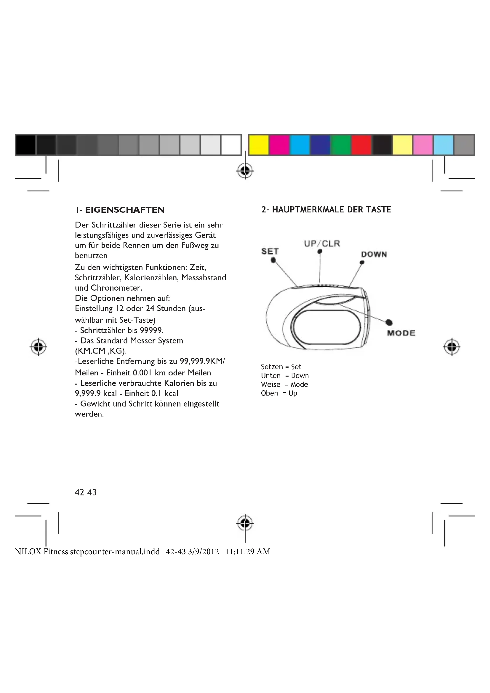 (ABSTAND) -Drücken Sie Mode für Kalorien + “ODO” -Die obere Teil der Anzeige zeigt die ver- brauchten Kalorien, und den unteren Teil zeigt die zurückgelegte Gesamtstrecke (ODO). -Es ist möglich, auf Null die gesamte Strecke nur durch Auswechseln der Batterien. NILOX Fitness stepcounter-manual.indd 44-45 3/9/2012 11:11:29 AM46 47