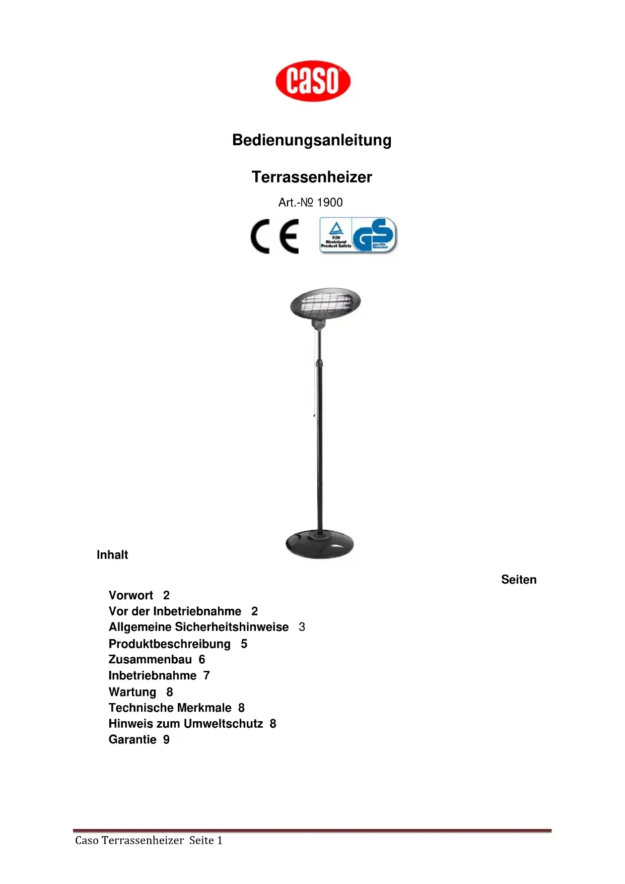 Laden Sie die Anleitung für Ihr Heizung kostenlos im PDF-Format! Finden Sie Ihr Handbuch 1900 - CASO und nehmen Sie Ihr elektronisches Gerät wieder in die Hand. Auf dieser Seite sind alle Dokumente veröffentlicht, die für die Verwendung Ihres Geräts notwendig sind. 1900 von der Marke CASO.