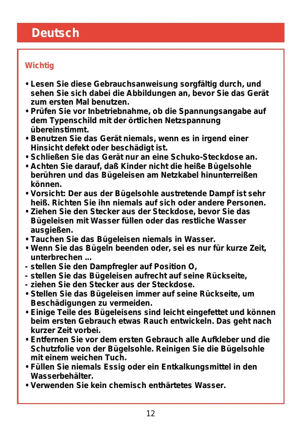 - Tauchen Sie das Bügeleisen niemals in Wasser.