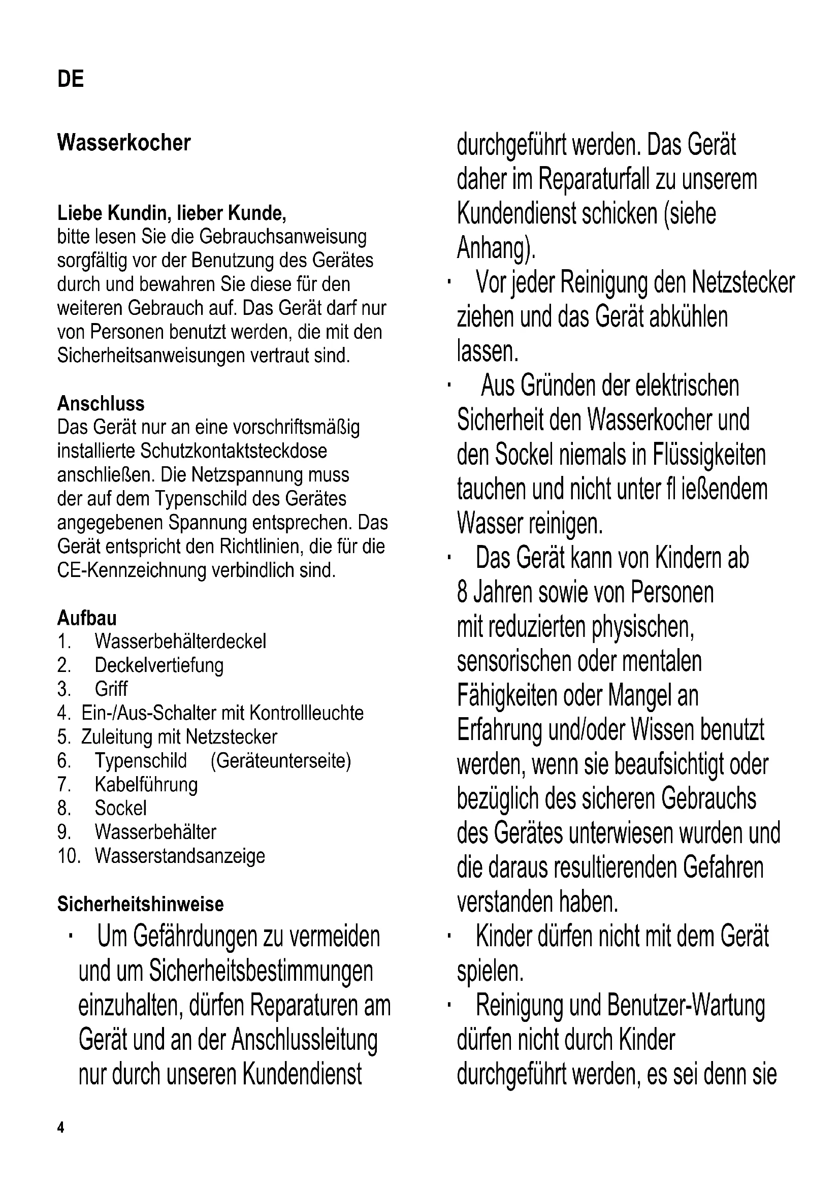 Wasserkocher Liebe Kundin, lieber Kunde, bitte lesen Sie die Gebrauchsanweisung sorgfältig vor der Benutzung des Gerätes durch und bewahren Sie diese für den weiteren Gebrauch auf. Das Gerät darf nur von Personen benutzt werden, die mit den Sicherheitsanweisungen vertraut sind. Anschluss Das Gerät nur an eine vorschriftsmäßig installierte Schutzkontaktsteckdose anschließen. Die Netzspannung muss der auf dem Typenschild des Gerätes angegebenen Spannung entsprechen. Das Gerät entspricht den Richtlinien, die für die CE-Kennzeichnung verbindlich sind. Aufbau