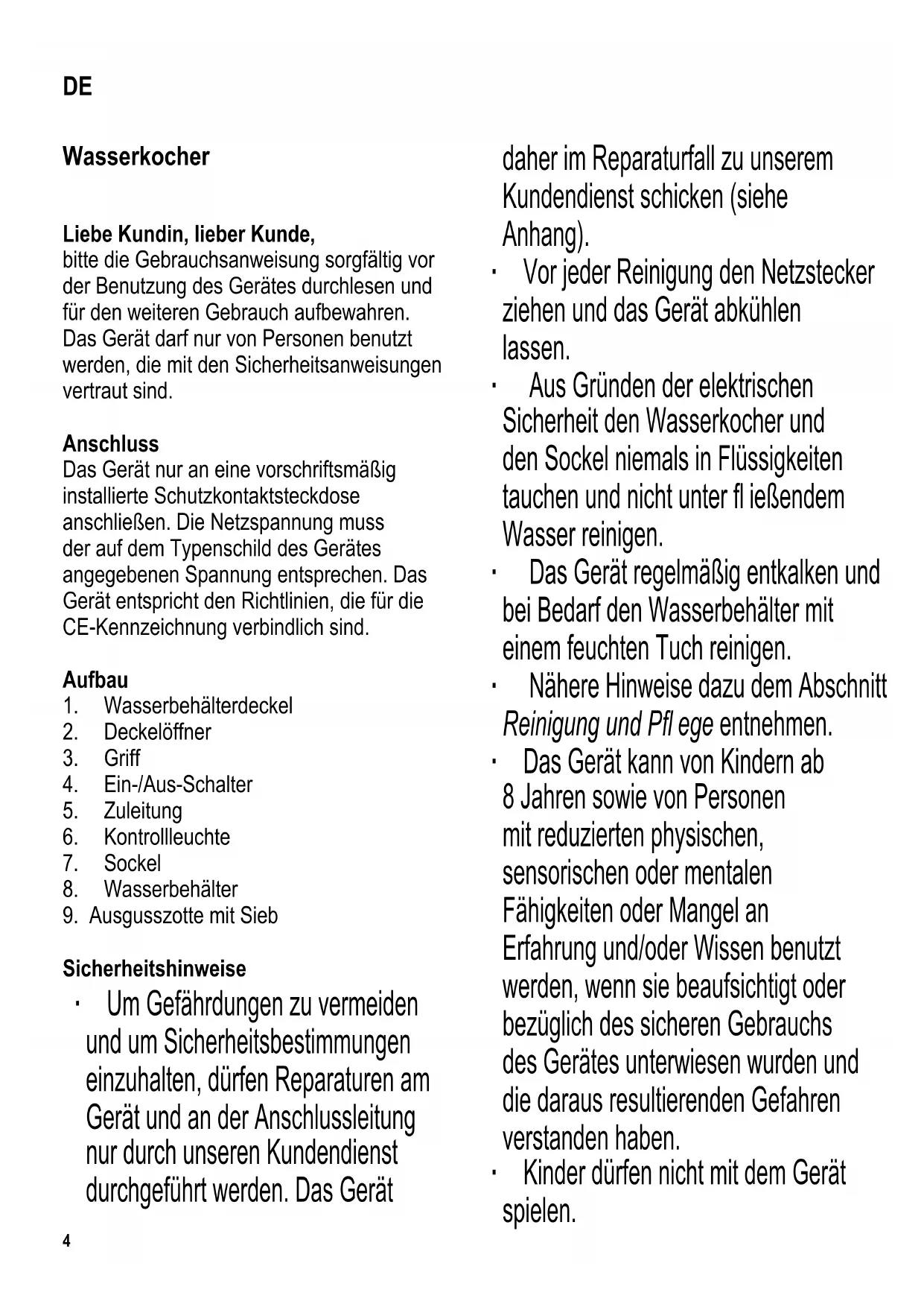 Sicherheitshinweise ∙ Um Gefährdungen zu vermeiden und um Sicherheitsbestimmungen einzuhalten, dürfen Reparaturen am Gerät und an der Anschlussleitung nur durch unseren Kundendienst durchgeführt werden. Das Gerät daher im Reparaturfall zu unserem Kundendienst schicken (siehe Anhang). ∙ Vor jeder Reinigung den Netzstecker ziehen und das Gerät abkühlen lassen. ∙ Aus Gründen der elektrischen Sicherheit den Wasserkocher und den Sockel niemals in Flüssigkeiten tauchen und nicht unter fl ießendem Wasser reinigen. ∙ Das Gerät regelmäßig entkalken und bei Bedarf den Wasserbehälter mit einem feuchten Tuch reinigen. ∙ Nähere Hinweise dazu dem Abschnitt Reinigung und Pfl ege entnehmen. ∙ Das Gerät kann von Kindern ab 8 Jahren sowie von Personen mit reduzierten physischen, sensorischen oder mentalen Fähigkeiten oder Mangel an Erfahrung und/oder Wissen benutzt werden, wenn sie beaufsichtigt oder bezüglich des sicheren Gebrauchs des Gerätes unterwiesen wurden und die daraus resultierenden Gefahren verstanden haben. ∙ Kinder dürfen nicht mit dem Gerät spielen. DE5 ∙ Reinigung und Benutzer-Wartung dürfen nicht durch Kinder durchgeführt werden, es sei denn sie sind 8 Jahre oder älter und werden beaufsichtigt. ∙ Kinder jünger als 8 Jahre sind vom Gerät und der Anschlussleitung fernzuhalten. ∙ Das Gerät ist dazu bestimmt, im Haushalt und ähnlichen Anwendungen verwendet zu werden, wie z.B. - von Mitarbeitern in Läden, Büros und ähnlichen Arbeitsumgebungen, - in landwirtschaftlichen Betrieben, - von Kunden in Hotels, Motels und weiteren typischen Wohnumgebungen, - in Frühstückspensionen. ∙ Die Gehäuseoberfl ächen sind bei und nach dem Betrieb heiß. ∙ Den Wasserkocher nur unter Aufsicht mit reinem Wasser betreiben. Bitte die Min- (0.5 l) und Max-Markierungen (1.0 l) für die Füllmenge beachten. Bei Überfüllung kann kochendes Wasser herausspritzen. ∙ Auch auf austretenden Dampf im Deckelbereich achten (Verbrühungsgefahr!). Deshalb den Wasserkocher bei Betrieb nur im Griffbereich berühren. ∙ Achtung! Der Deckel muss beim Kochvorgang und beim Ausschütten geschlossen bleiben. ∙ Der Wasserbehälter darf nur mit dem vorgesehenen Sockel betrieben werden. ∙ Den Wasserbehälter nur vom Sockel abnehmen oder aufsetzen, wenn das Gerät ausgeschaltet ist. ∙ Der elektrische Kontakt am Sockel muss vor Spritzwasser geschützt werden. ∙ Vorsicht! Missbrauch des Gerätes kann zu Verletzungen führen. ∙ Kinder von Verpackungsmaterial fernhalten. Es besteht u.a. Erstickungsgefahr! ∙ Vor der Inbetriebnahme das komplette Gerät inkl. Anschlussleitung und eventueller Zubehörteile auf Mängel und Beschädigungen überprüfen, die die Funktionssicherheit des Gerätes beeinträchtigen könnten. Falls das Gerät z.B. zu Boden gefallen ist oder an der Anschlussleitung gezogen wurde, können von außen nicht erkennbare Schäden vorliegen. In diesen Fällen das Gerät nicht in Betrieb nehmen. ∙ Das Gerät auf eine wärmebeständige6 ebene Fläche stellen. ∙ Das Gerät darf während der Inbetriebnahme nicht unter Hängeschränken stehen, da der Dampf sich darunter stauen kann. ∙ Weder das Gerät noch die Anschlussleitung dürfen einer heißen Kochplatte oder offenem Feuer zu nahe kommen. ∙ Die Anschlussleitung nicht herunterhängen lassen und von heißen Geräteteilen fernhalten. ∙ Den Netzstecker ziehen, - bei Störungen während des Betriebes, - nach jedem Gebrauch, - vor jeder Reinigung. ∙ Wird das Gerät falsch bedient, oder zweckentfremdet verwendet, kann keine Haftung für evtl. auftretende Schäden übernommen werden. Überhitzungsschutz Der fest eingestellte Temperaturregler schützt den Heizkörper vor Überhitzung, falls das Gerät versehentlich ohne Wasser eingeschaltet wurde oder die Heizplatte verkalkt ist. Hat der Temperaturregler einmal abgeschaltet, den Wasserkocher erst abkühlen lassen und evtl. entkalken, bevor er erneut betrieben wird. Erste Inbetriebnahme Aus hygienischen Gründen die erste Kochfüllung des neuen Wasserkochers wegschütten. Kochvorgang ∙ Wasserbehälter vom Sockel nehmen. ∙ Den Deckelöffner am Wasserbehälterdeckel drücken, der Deckel klappt auf und die gewünschte Wassermenge kann eingefüllt werden. Bitte die Min- (0.5 l) und Max- Markierungen (1.0 l) für die Füllmenge beachten. ∙ Den Deckel schließen und den Wasserbehälter wieder auf den Sockel setzen. ∙ Netzstecker einstecken und den Wasserkocher mit dem Ein-/Ausschalter einschalten, die Kontrollleuchte leuchtet auf. ∙ Der Kochvorgang beginnt und die Dampfstoppautomatik schaltet den Wasserkocher nach Erreichen des Siedepunktes automatisch ab. Die Kontrollleuchte erlischt. ∙ Soll der Kochvorgang vorher beendet werden, den Wasserkocher mit dem Ein-/ Ausschalter ausschalten. ∙ Zum Ausgießen den Wasserbehälter vom Sockel nehmen. ∙ Der Deckel muss beim Ausgießen geschlossen bleiben, damit kein heißer Dampf austritt. ∙ Nach dem Gebrauch den Netzstecker aus der Steckdose ziehen. ∙ Kein Restwasser im Wasserbehälter lassen. Kabelaufwicklung Auf der Unterseite des Sockels befi ndet sich eine Kabelaufwicklung. Die Kabelaufwicklung dient zur Aufbewahrung oder Begrenzung der Kabellänge. Entkalken ∙ Je nach Kalkgehalt des Wassers bilden sich Kalkrückstände auf der Heizplatte. Aus diesem Grund den Wasserkocher regelmäßig entkalken. ∙ Der Garantieanspruch erlischt bei7 Geräten, die aufgrund mangelnder Entkalkung nicht einwandfrei funktionieren. ∙ Zum Entkalken eignet sich eine Mischung aus einem halben Liter Wasser und 40 ml Essigessenz. ∙ Die Entkalkerlösung einfüllen, ∙ wie gewohnt aufkochen, ∙ kurz einwirken lassen. ∙ Zur Reinigung den Wasserbehälter mit klarem Wasser ausspülen. ∙ Dabei für eine ausreichende Lüftung sorgen und den Essigdampf nicht einatmen. ∙ Entkalkungsmittel nicht in emaillierte Abfl ussbecken gießen. Sieb Bei starker Verschmutzung kann das Sieb in der Ausgusszotte zur Reinigung entnommen