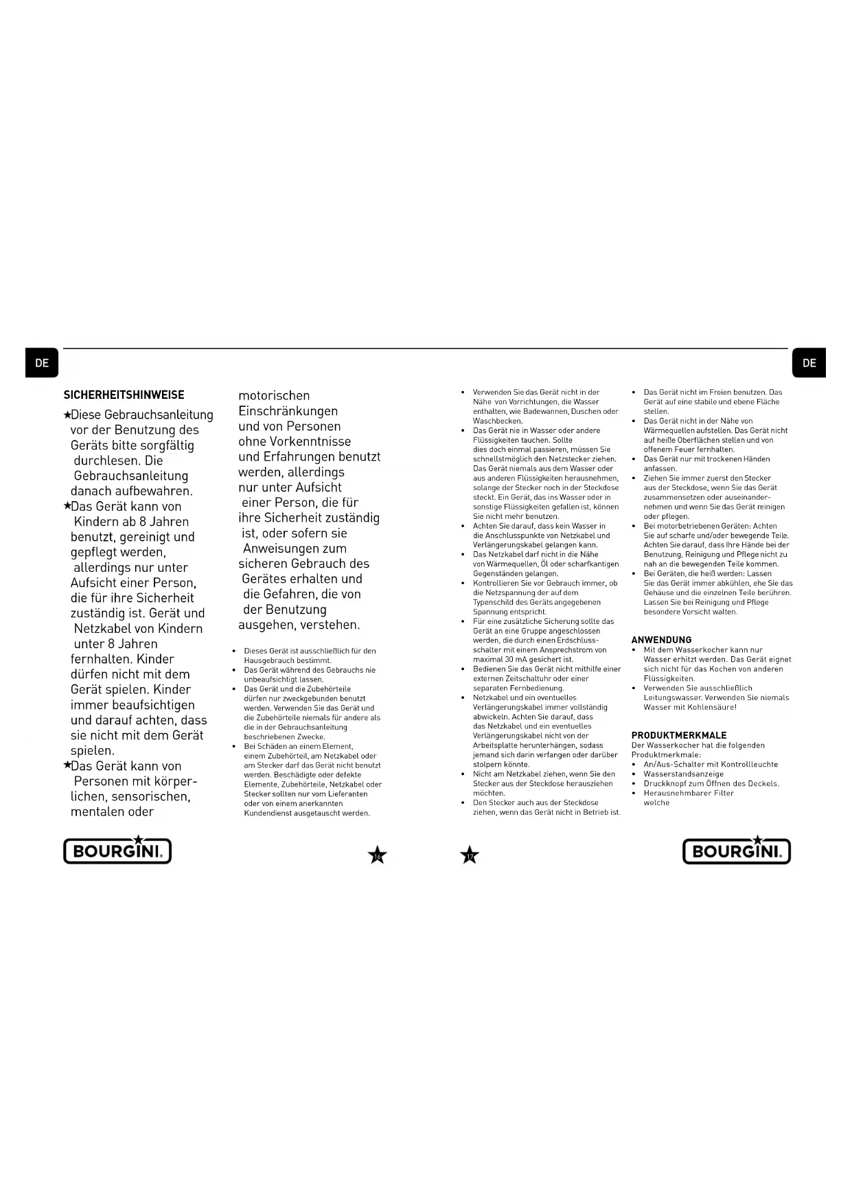 GARANTIE Die Garantie wird für die Dauer von zwei Jahren ab dem auf dem Kassenbon angegebenen Kaufdatum gewährt. Der Kassenbon gilt als Garantieschein. Sie können die Garantie bei dem Einzelhändler einlösen, bei dem Sie das Gerät gekauft haben. Die Garantie deckt keine Schäden, die durch falsche Nutzung, unsachgemäßes Auseinandernehmen, Fallenlassen, Stöße u. Ä. entstanden sind sowie Schäden an Geräten, die mit Wasser benutzt werden, die durch zu spätes Entkalken entstehen. Sofern bei einem bestimmten Produkt besondere Garantiebestimmungen angegeben werden, gelten diese vor den Allgemeinen Garantiebestimmungen. Die Garantie gilt nicht für Folgeschäden. Bei Fragen zur Anwendung des Produkts besuchen Sie bitte unsere Website: www.bourgini.com HAFTUNGSAUSSCHLUSS Änderungen vorbehalten; Produktspezifikationen können ohne Angabe von Gründen geändert werden. DE DE