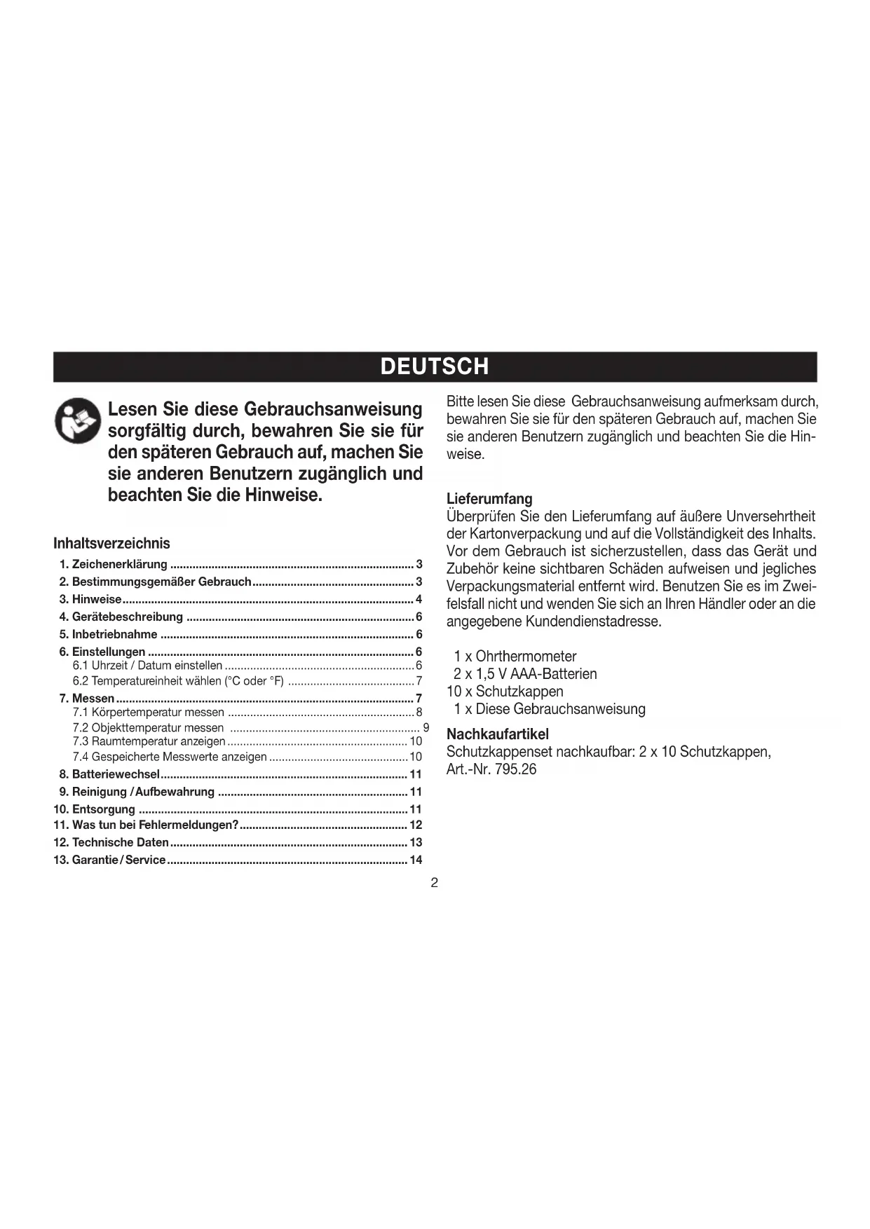 ständig oder in der Funktionstüchtigkeit als mangelhaft gemäß der nachfolgenden Bestimmungen erweist, wird HaDi gemäß diesen Garantiebedingungen eine kostenfreie Ersatzlieferung oder Reparatur durchführen. Wenn der Käufer einen Garantiefall melden möchte, wen- det er sich zunächst an den HaDi Kundenservice: Tel: +49 7374 915766 service@sanitas-online.de Für eine zügige Bearbeitung nutzen Sie bitte unser Kontakt- formular auf der Homepage https://sanitas-online.de unter der Rubrik ‚Kundenservice‘. Der Käufer erhält dann nähere Informationen zur Abwicklung des Garantiefalls, z.B. wohin er das Produkt kostenfrei senden kann und welche Unterlagen erforderlich sind. Eine Inanspruchnahme der Garantie kommt nur in Betracht, wenn der Käufer - eine Rechnungskopie/Kaufquittung und - das Original-Produkt HaDi oder einem von HaDi autorisierten Partner vorlegen kann. Ausdrücklich ausgenommen von dieser Garantie sind - Verschleiß, der auf normalem Gebrauch oder Verbrauch des Produktes beruht; - zu diesem Produkt mitgelieferte Zubehörteile, die sich bei sachgemäßen Gebrauch abnutzen bzw. verbraucht werden (z.B. Batterien, Akkus, Manschetten, Dichtungen, Elektroden, Leuchtmittel, Aufsätze, Inhalatorzubehör); - Produkte, die unsachgemäß und/oder entgegen der Bestim- mungen der Bedienungsanleitung verwendet, gereinigt, gela- gert oder gewartet wurden sowie Produkte, die vom Käufer oder einem nicht von HaDi autorisierten Servicecenter ge- önet, repariert oder umgebaut wurden;15 - Schäden, die auf dem Transportweg zwischen Hersteller und Kunde bzw. zwischen Servicecenter und Kunde entstehen - Produkte, die als 2.Wahl-Artikel oder als gebrauchte Artikel gekauft wurden; - Folgeschäden, welche auf einem Mangel dieses Produktes beruhen (es können für diesen Fall jedoch Ansprüche aus Produkthaftung oder aus anderen zwingenden gesetzlichen Haftungsbestimmungen bestehen). Reparaturen oder ein Komplettaustausch verlängern in keinem Fall die Garantiezeit. Irrtum und Änderungen vorbehalten16 ENGLISH Read these instructions for use care fully and keep them for later use, be sure to make them accessible to other users and observe the information they con- tain. Please read through these Instructions for Use carefully and retain them for future reference; make them available to other users and observe the information they contain. Included in delivery Check that the delivery has not been tampered with and make sure that all components are present. Before use, ensure that there is no visible damage to the device or accessories and that all packaging material has been removed. If you have any doubts, do not use the device and contact your retailer or the specified Customer Services address. 1 x ear thermometer 2 x 1.5 V AAA batteries 10 x protective caps 1 x set of instructions for use Subsequent purchase articles Protective cap set replacement available: 2 x 10 protective caps, item no. 795.26