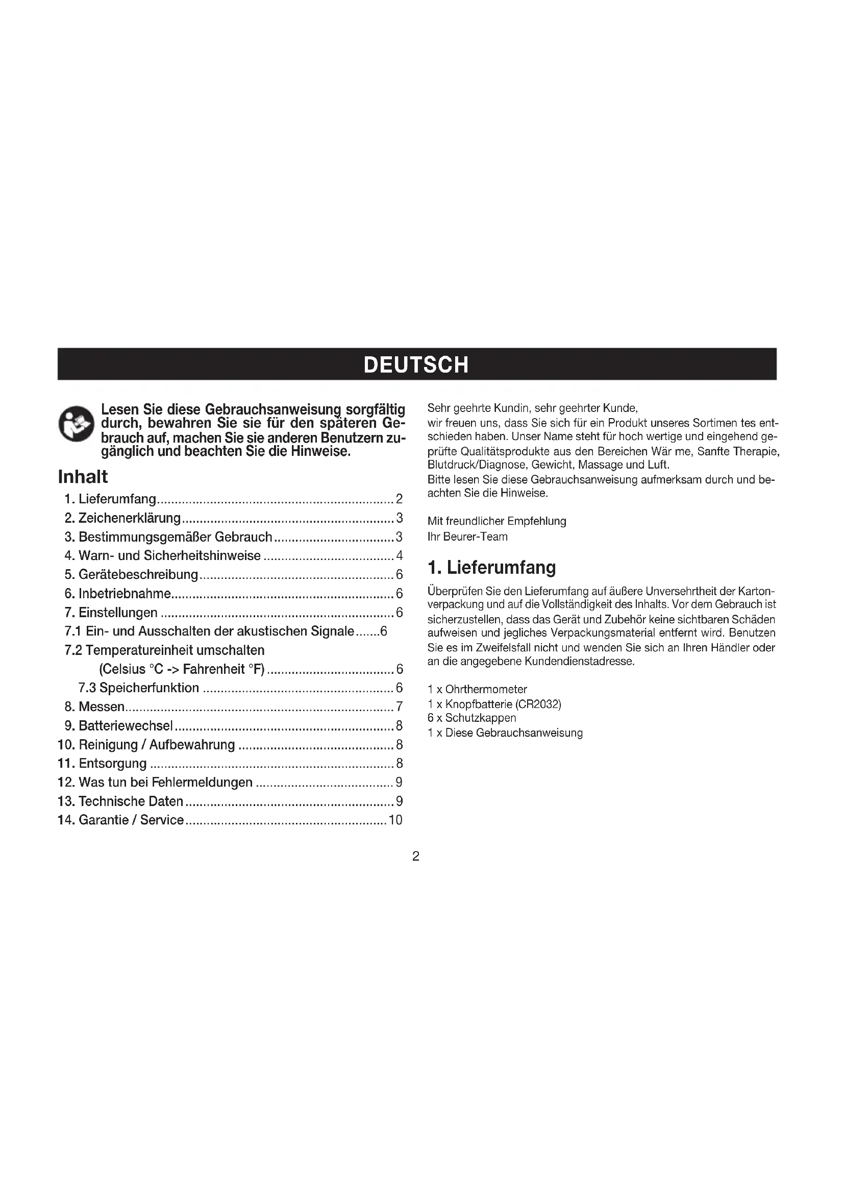 Überprüfen Sie den Lieferumfang auf äußere Unversehrtheit der Karton-verpackung und auf die Vollständigkeit des Inhalts. Vor dem Gebrauch ist sicherzustellen, dass das Gerät und Zubehör keine sichtbaren Schäden aufweisen und jegliches Verpackungsmaterial entfernt wird. Benutzen Sie es im Zweifelsfall nicht und wenden Sie sich an Ihren Händler oder an die angegebene Kundendienstadresse.1 x Ohrthermometer1 x Knopfbatterie (CR2032)6 x Schutzkappen1 x Diese Gebrauchsanweisung Lesen Sie diese Gebrauchsanweisung sorgfältig durch, bewahren Sie sie für den späteren Ge- brauch auf, machen Sie sie anderen Benutzern zu- gänglich und beachten Sie die Hinweise.3