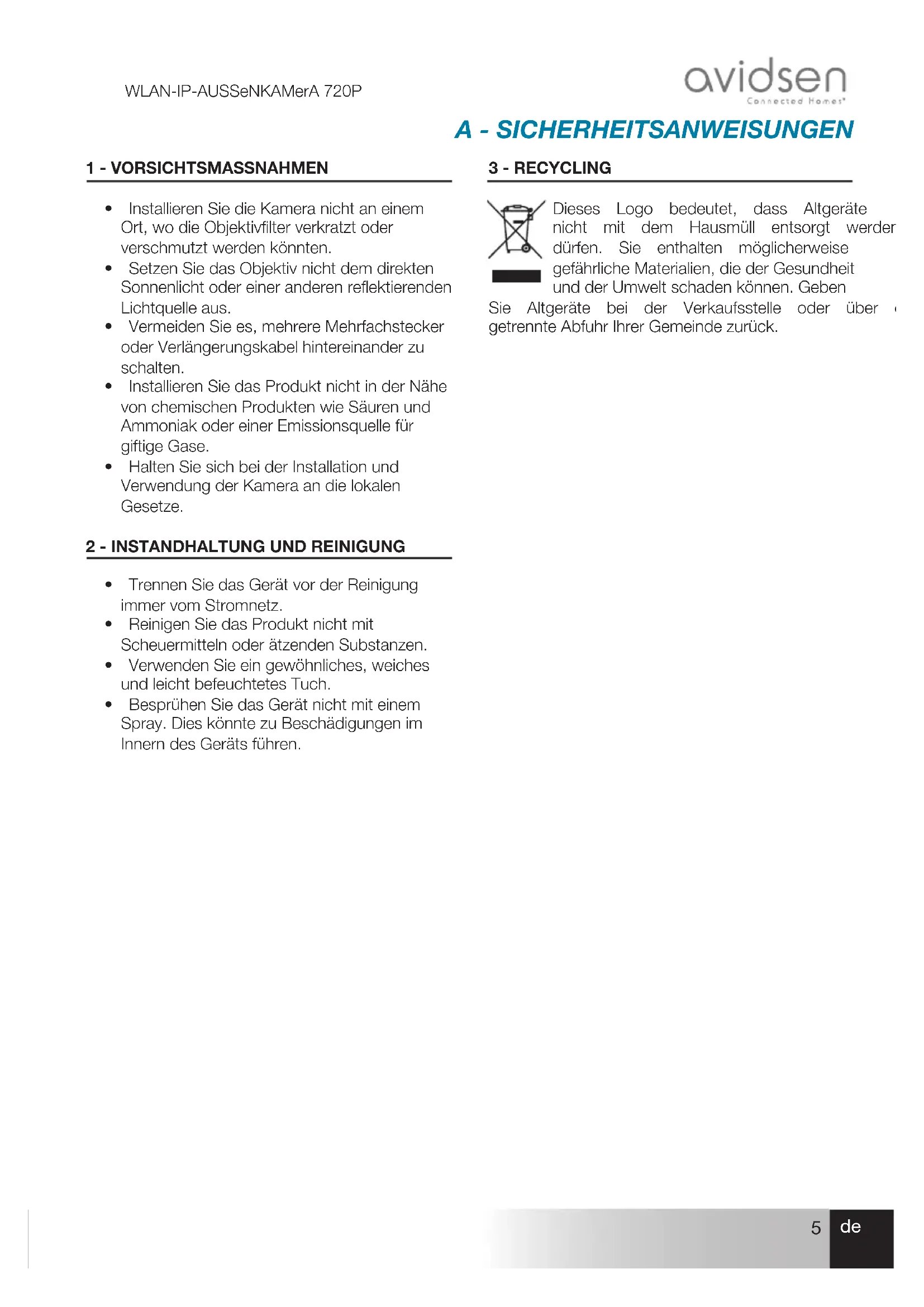 Laden Sie die Anleitung für Ihr Überwachungskamera kostenlos im PDF-Format! Finden Sie Ihr Handbuch 123281 WiFi - AVIDSEN und nehmen Sie Ihr elektronisches Gerät wieder in die Hand. Auf dieser Seite sind alle Dokumente veröffentlicht, die für die Verwendung Ihres Geräts notwendig sind. 123281 WiFi von der Marke AVIDSEN.