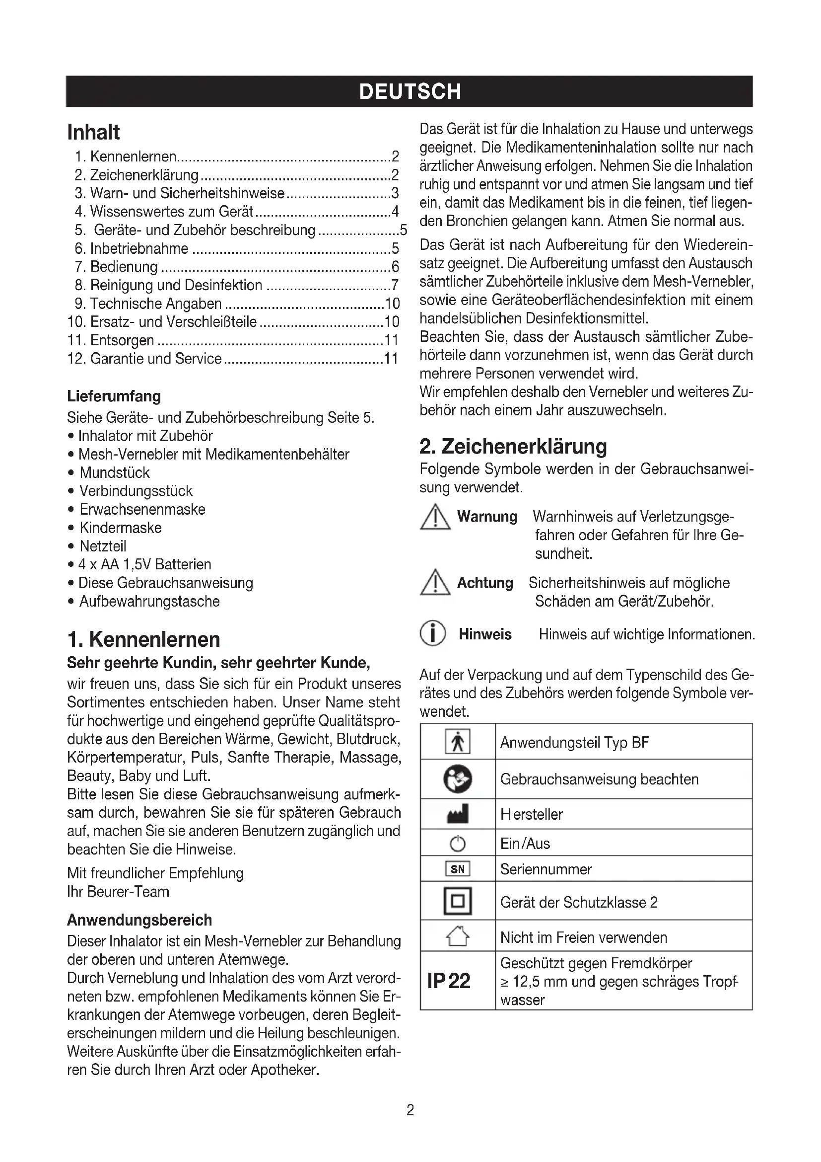 Sehr geehrte Kundin, sehr geehrter Kunde, wir freuen uns, dass Sie sich für ein Produkt unseres Sortimentes entschieden haben. Unser Name steht für hochwertige und eingehend geprüfte Qualitätspro- dukte aus den Bereichen Wärme, Gewicht, Blutdruck, Körpertemperatur, Puls, Sanfte Therapie, Massage, Beauty, Baby und Luft. Bitte lesen Sie diese Gebrauchsanweisung aufmerk- sam durch, bewahren Sie sie für späteren Gebrauch auf, machen Sie sie anderen Benutzern zugänglich und beachten Sie die Hinweise. Mit freundlicher Empfehlung Ihr Beurer-Team Anwendungsbereich Dieser Inhalator ist ein Mesh-Vernebler zur Behandlung der oberen und unteren Atemwege. Durch Verneblung und Inhalation des vom Arzt verord- neten bzw. empfohlenen Medikaments können Sie Er- krankungen der Atemwege vorbeugen, deren Begleit- erscheinungen mildern und die Heilung beschleunigen. Weitere Auskünfte über die Einsatzmöglichkeiten erfah- ren Sie durch Ihren Arzt oder Apotheker. Das Gerät ist für die Inhalation zu Hause und unterwegs geeignet. Die Medikamenteninhalation sollte nur nach ärztlicher Anweisung erfolgen. Nehmen Sie die Inhalation ruhig und entspannt vor und atmen Sie langsam und tief ein, damit das Medikament bis in die feinen, tief liegen- den Bronchien gelangen kann. Atmen Sie normal aus. Das Gerät ist nach Aufbereitung für den Wiederein- satz geeignet. Die Aufbereitung umfasst den Austausch sämtlicher Zubehörteile inklusive dem Mesh-Vernebler, sowie eine Geräteoberflächendesinfektion mit einem handelsüblichen Desinfektionsmittel. Beachten Sie, dass der Austausch sämtlicher Zube- hörteile dann vorzunehmen ist, wenn das Gerät durch mehrere Personen verwendet wird. Wir empfehlen deshalb den Vernebler und weiteres Zu- behör nach einem Jahr auszuwechseln.