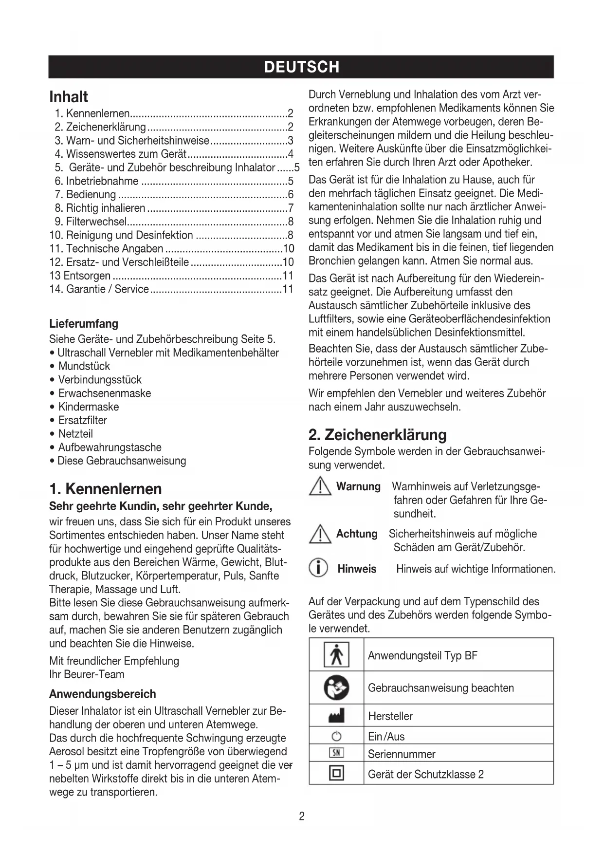 sam durch, bewahren Sie sie für späteren Gebrauch auf, machen Sie sie anderen Benutzern zugänglich und beachten Sie die Hinweise. Mit freundlicher Empfehlung Ihr Beurer-Team Anwendungsbereich Dieser Inhalator ist ein Ultraschall Vernebler zur Be- handlung der oberen und unteren Atemwege. Das durch die hochfrequente Schwingung erzeugte Aerosol besitzt eine Tropfengröße von überwiegend 1 – 5 μm und ist damit hervorragend geeignet die ver