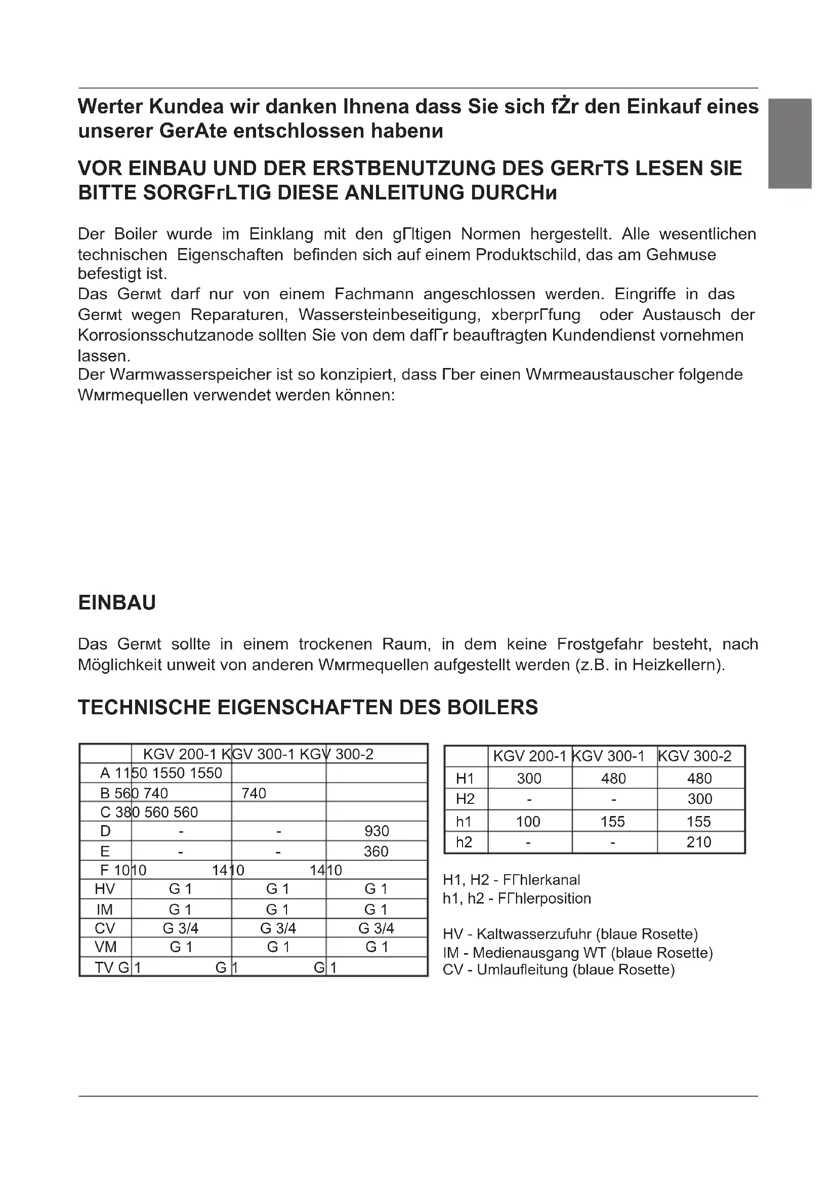 |êiêê4±êê4êêêzêê lê±êêêl4êê~êQêêoê iêHêiêê~êêê~ê4êêêêê f¡¨ªêmêêêoHêê{êyêêêêêênꦽ¤ê hêêêoHêê{êzoêê±êê® - wenn Sie eine höhere Wassertemperatur wünschen, als mit den vorhandenen Wärmequellen erzielt werden kann, - wenn saisonbedingt oder aufgrund anderer Ursachen die Hauptwärmequellen nicht zur Verfügung stehen. Bei Frostgefahr im Boiler ist das Wasser aus dem Gerät zu entleeren. Danach öffnen Sie den Warmwasserhahn an der Mischbatterie, die an das Gerät angeschlossen ist. Das Wasser ist über das dafür vorgesehene Ablassventil am Zulaufrohr zu entleeren. Die Gerätoberfläche kann mit einer leichten Waschmittellösung gereinigt werden. Lösungs- und grobe Reinigungsmittel sind zu vermeiden. Durch regelmässige Kontrollen, die vom Kundendienst ausgeführt werden, garantieren Sie Ihrem Gerät eine einwandfreie Betriebsweise und lange Lebensdauer. Die erste Kontrolle sollte etwa zwei Jahre nach Anschluss des Geräts vom Kundendienst erfolgen. Dabei wird die Abnutzung der Korrosionsschutzanode überprüft und wenn notwendig, Wasserstein entfernt, der sich je nach Qualität, Menge und Temperatur des verbrauchten Wassers im Inneren des Boilers bilden kann. Das Datum der nächsten Kontrolle wird Ihnen dann im Hinblick auf den Zustand des Geräts vom Kundendienst empfohlen. Der Verschleiss der Korrosionsschutzanode wird optisch überprüft. Die Anode muss ausgetauscht werden, wenn bei der Kontrolle festgestellt wird, dass sich ihr Durchmesser stark verringert hat oder die Abnutzung bereits bis auf den Stahlkern erfolgt ist. Garantieleistungen können nur in Anspruch genommen werden, wenn die Schutzanode regelmässig überprüft worden ist. Wir bitten Sie, eventuelle Schäden am Boiler nicht selbst zu beheben, sondern umgehend den nächsten Kundendienst zu benachrichtigen. k¡¤ Estimado comprador, Le agradecemos su confianza al elegir nuestro producto. POR FAVOR LEA LAS INSTRUCCIONES ANTES DE INSTALAR Y UTILIZAR POR PRIMERA VEZ EL DEPOSITO DE AGUA CALIENTE. El deposito de agua caliente está fabricado conforme con todas las normas existentes. Sus características técnicas básicas se encuentran en la matricula pegada sobre el marco de protección. Solo el personal cualificado puede conectar el depósito de agua caliente. Cualquier intervención en su interior por causa de avería, eliminación de piedras producidas por el agua o el cambio del ánodo protector anticorrosión, puede realizarla solo el personal autorizado. El depósito de agua caliente está fabricado de manera que permite utilizar las siguientes fuentes de calor a través de un transformador calorífero: - Caldera de calefacción central - Energía solar - Bomba de calor Al depósito de agua caliente se le puede incorporar un elemento calorífero de tipo R utilizando una brida de f180mm, o se le puede añadir otro elemento calorífero de tipo SH utilizando conector G 6/4. INSTACIÓN El depósito de agua caliente ha de instalarse en un ambiente seco, si es posible, colocarlo al lado de otras fuentes caloríferas (por ejemplo, caldera). CARACTERISTICAS TECNICAS DEL DEPÓSITO DE AGUA CALIENTE