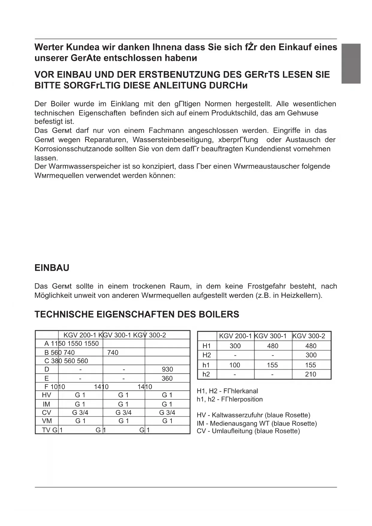 |êiêê4±êê4êêêzêê lê±êêêl4êê~êQêêoê iêHêiêê~êêê~ê4êêêêê f¡¨ªêmêêêoHêê{êyêêêêêênꦽ¤ê hêêêoHêê{êzoêê±êê® - wenn Sie eine höhere Wassertemperatur wünschen, als mit den vorhandenen Wärmequellen erzielt werden kann, - wenn saisonbedingt oder aufgrund anderer Ursachen die Hauptwärmequellen nicht zur Verfügung stehen. Bei Frostgefahr im Boiler ist das Wasser aus dem Gerät zu entleeren. Danach öffnen Sie den Warmwasserhahn an der Mischbatterie, die an das Gerät angeschlossen ist. Das Wasser ist über das dafür vorgesehene Ablassventil am Zulaufrohr zu entleeren. Die Gerätoberfläche kann mit einer leichten Waschmittellösung gereinigt werden. Lösungs- und grobe Reinigungsmittel sind zu vermeiden. Durch regelmässige Kontrollen, die vom Kundendienst ausgeführt werden, garantieren Sie Ihrem Gerät eine einwandfreie Betriebsweise und lange Lebensdauer. Die erste Kontrolle sollte etwa zwei Jahre nach Anschluss des Geräts vom Kundendienst erfolgen. Dabei wird die Abnutzung der Korrosionsschutzanode überprüft und wenn notwendig, Wasserstein entfernt, der sich je nach Qualität, Menge und Temperatur des verbrauchten Wassers im Inneren des Boilers bilden kann. Das Datum der nächsten Kontrolle wird Ihnen dann im Hinblick auf den Zustand des Geräts vom Kundendienst empfohlen. Der Verschleiss der Korrosionsschutzanode wird optisch überprüft. Die Anode muss ausgetauscht werden, wenn bei der Kontrolle festgestellt wird, dass sich ihr Durchmesser stark verringert hat oder die Abnutzung bereits bis auf den Stahlkern erfolgt ist. Garantieleistungen können nur in Anspruch genommen werden, wenn die Schutzanode regelmässig überprüft worden ist. Wir bitten Sie, eventuelle Schäden am Boiler nicht selbst zu beheben, sondern umgehend den nächsten Kundendienst zu benachrichtigen. k¡¤ Estimado comprador, Le agradecemos su confianza al elegir nuestro producto. POR FAVOR LEA LAS INSTRUCCIONES ANTES DE INSTALAR Y UTILIZAR POR PRIMERA VEZ EL DEPOSITO DE AGUA CALIENTE. El deposito de agua caliente está fabricado conforme con todas las normas existentes. Sus características técnicas básicas se encuentran en la matricula pegada sobre el marco de protección. Solo el personal cualificado puede conectar el depósito de agua caliente. Cualquier intervención en su interior por causa de avería, eliminación de piedras producidas por el agua o el cambio del ánodo protector anticorrosión, puede realizarla solo el personal autorizado. El depósito de agua caliente está fabricado de manera que permite utilizar las siguientes fuentes de calor a través de un transformador calorífero: - Caldera de calefacción central - Energía solar - Bomba de calor Al depósito de agua caliente se le puede incorporar un elemento calorífero de tipo R utilizando una brida de f180mm, o se le puede añadir otro elemento calorífero de tipo SH utilizando conector G 6/4. INSTACIÓN El depósito de agua caliente ha de instalarse en un ambiente seco, si es posible, colocarlo al lado de otras fuentes caloríferas (por ejemplo, caldera). CARACTERISTICAS TECNICAS DEL DEPÓSITO DE AGUA CALIENTE