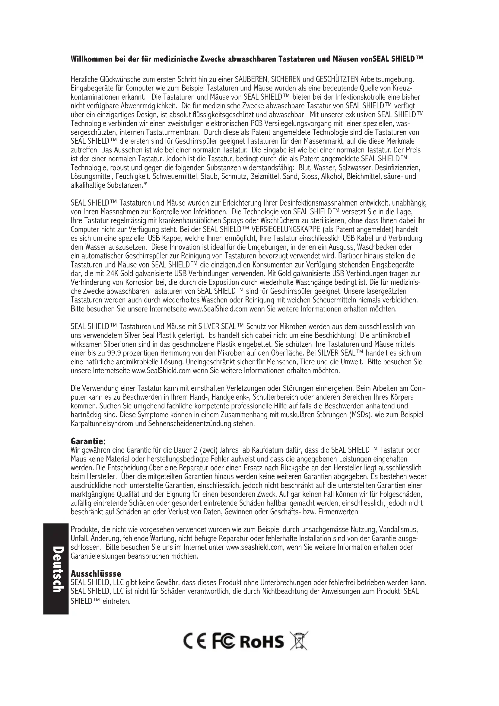 Wir gewähren eine Garantie für die Dauer 2 (zwei) Jahres ab Kaufdatum davon, dass die SEAL SHIELD™ Tastatur oder Maus keine Material oder herstellungsbedingte Fehler aufweist und dass die angegebenen Leistungen eingehalten werden. Die Entscheidung über eine Reparatur oder einen Ersatz nach Rückgabe an den Hersteller liegt ausschiesslich beim Hersteller. Über die mitgeteilenter Garantien hinaus werden keine weiteren Garantien abgegeben. Es bestehen weder ausdrückliche noch unterstelle Garantien, einschlisslich, jedoch nicht beschränkt auf die unterstellten Garantien einer marktgängene Qualität und der Eignung für einen besonderen Zweck. Auf gar keinen Fall konnen wir für Folgeschäden, zufällig eintretende Schäden oder gesondert eintretende Schäden haftbar gemacht werden, einschlisslich, jedoch nicht beschränkt auf Schäden an oder Verlust von Daten, Gewinnen oder Geschäfts- bzw. Firmenwerten.