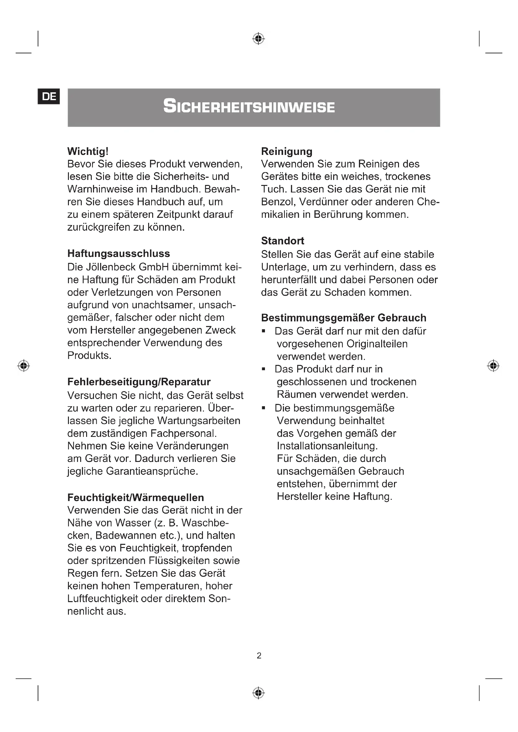 Die Jöllenbeck GmbH übernimmt keine Haftung für Schäden am Produkt oder Verletzungen von Personen aufgrund von unachtsamer, unsachgemäßer, falscher oder nicht dem vom Hersteller angegebenen Zweck entsprechender Verwendung des Produkts.