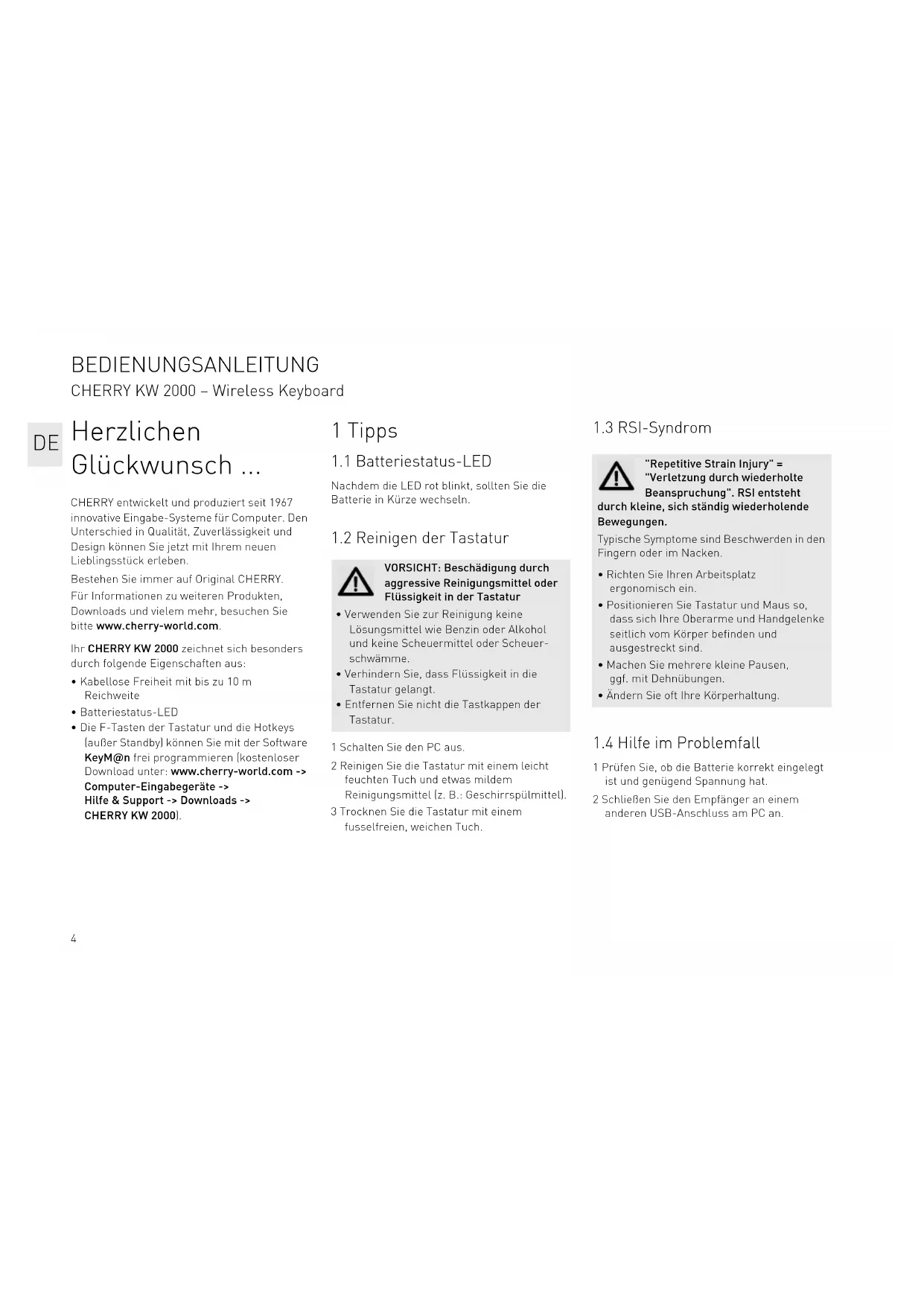 - Die F-Tasten der Tastatur und die Hotkeys (außer Standby) können Sie mit der Software KeyM@n frei programmieren (kostenloser Download unter: www.cherry-world.com -> Computer-Eingabegeräte -> Hilfe & Support -> Downloads -> CHERRY KW 2000). 1 Tipps