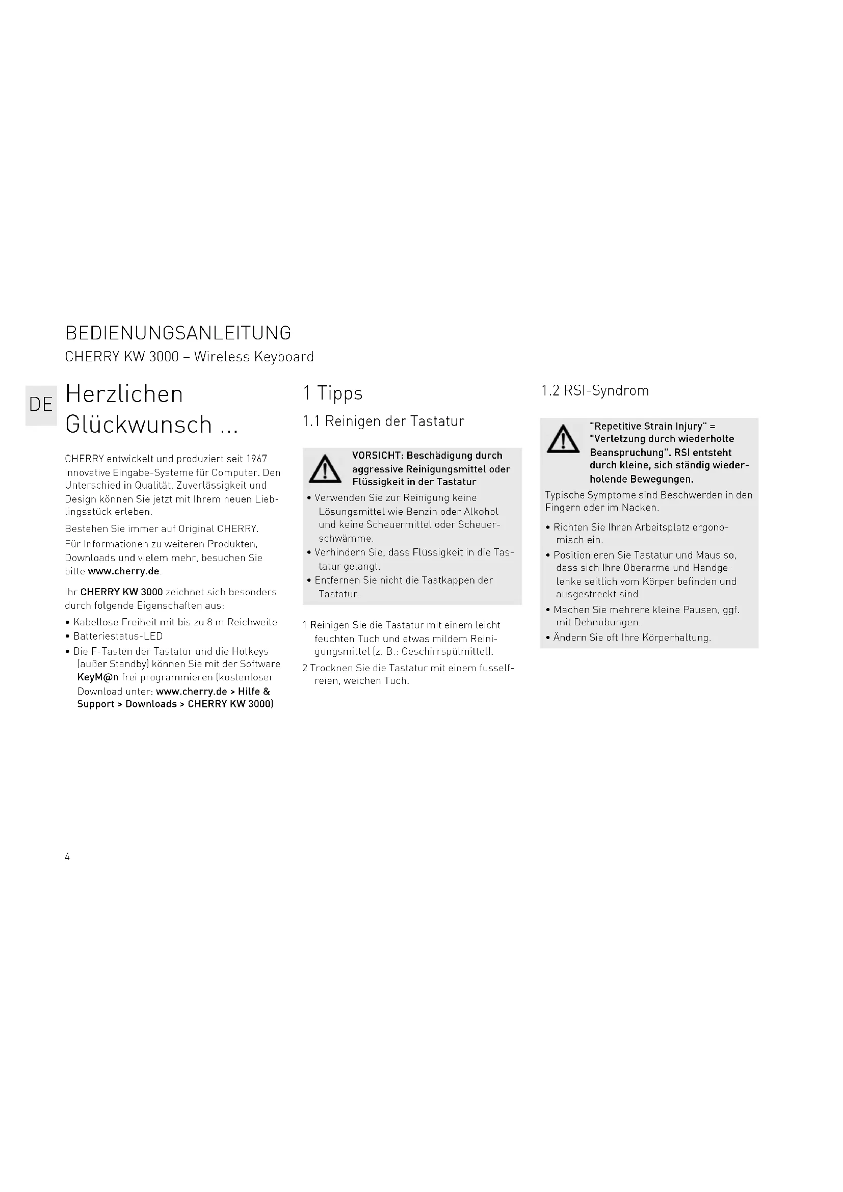 - Ändern Sie oft Ihre Körperhaltung. BEDIENUNGSANLEITUNG CHERRY KW 3000 – Wireless Keyboard DE5