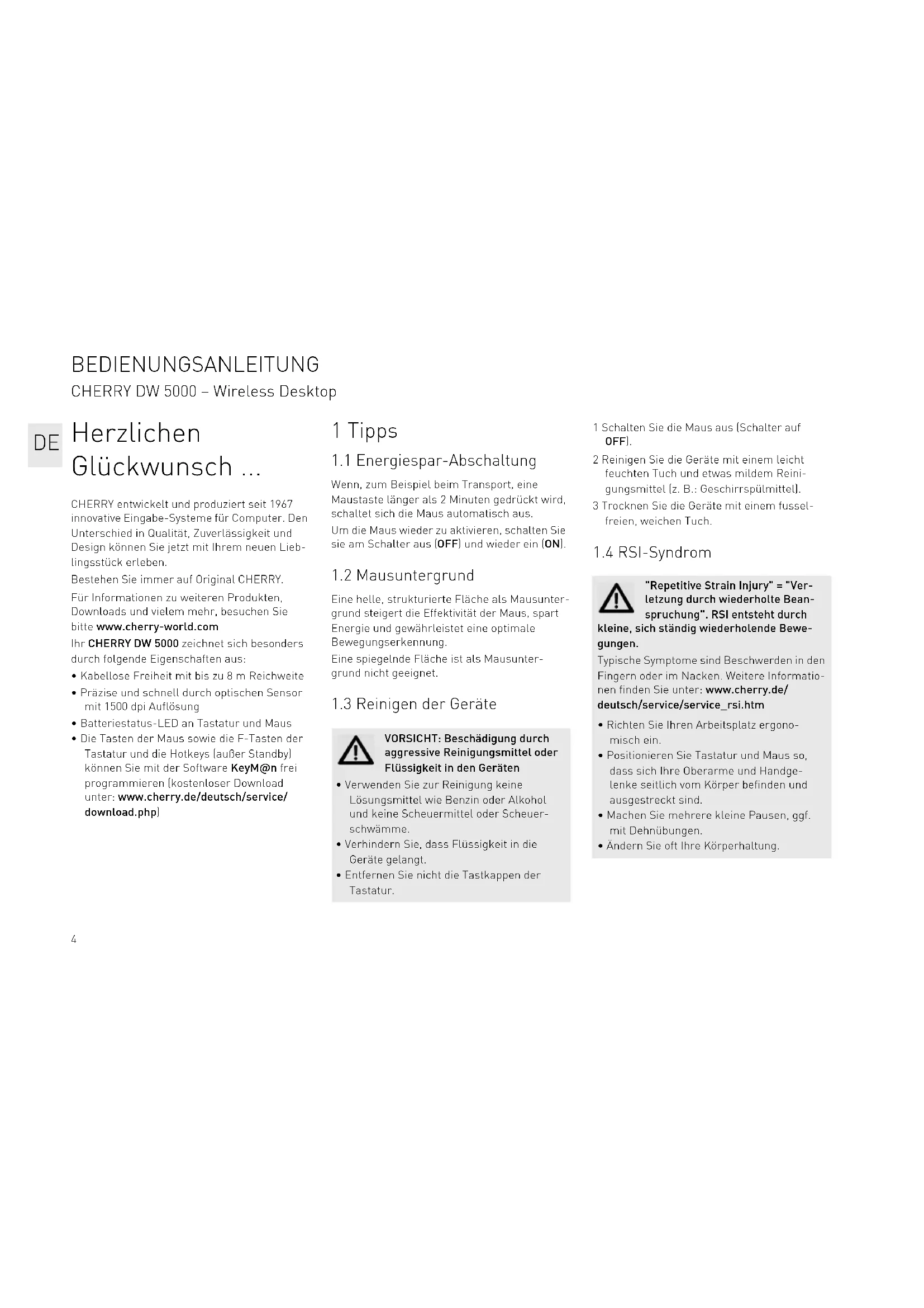 "Repetitive Strain Injury" = "Ver- letzung durch wiederholte Bean- spruchung". RSI entsteht durch kleine, sich ständig wiederholende Bewe- gungen. Typische Symptome sind Beschwerden in den Fingern oder im Nacken. Weitere Informatio- nen finden Sie unter: www.cherry.de/ deutsch/service/service_rsi.htm