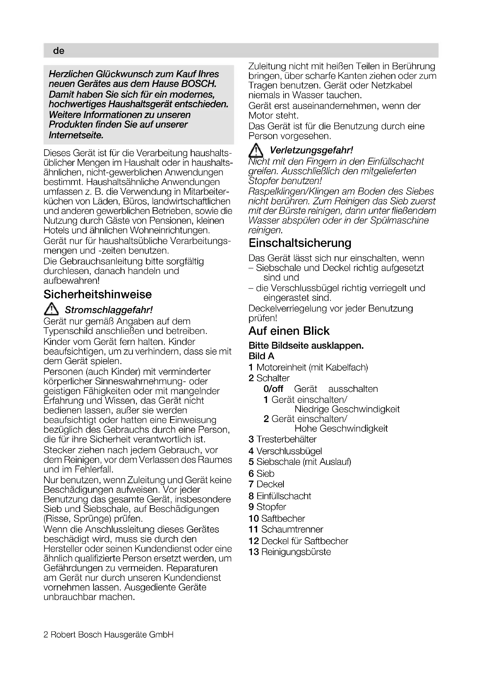 jbpOKKKLjbpPKKK2 Robert Bosch Hausgeräte GmbH Dieses Gerät ist für die Verarbeitung haushalts- üblicher Mengen im Haushalt oder in haushalts- ähnlichen, nicht-gewerblichen Anwendungen bestimmt. Haushaltsähnliche Anwendungen umfassen z. B. die Verwendung in Mitarbeiter- küchen von Läden, Büros, landwirtschaftlichen und anderen gewerblichen Betrieben, sowie die Nutzung durch Gäste von Pensionen, kleinen Hotels und ähnlichen Wohneinrichtungen. Gerät nur für haushaltsübliche Verarbeitungs- mengen und -zeiten benutzen. Die Gebrauchsanleitung bitte sorgfältig durchlesen, danach handeln und aufbewahren! Sicherheitshinweise píêçãëÅÜä~ÖÖÉÑ~Üê> Gerät nur gemäß Angaben auf dem Typenschild anschließen und betreiben. Kinder vom Gerät fern halten. Kinder beaufsichtigen, um zu verhindern, dass sie mit dem Gerät spielen. Personen (auch Kinder) mit verminderter körperlicher Sinneswahrnehmung- oder geistigen Fähigkeiten oder mit mangelnder Erfahrung und Wissen, das Gerät nicht bedienen lassen, außer sie werden beaufsichtigt oder hatten eine Einweisung bezüglich des Gebrauchs durch eine Person, die für ihre Sicherheit verantwortlich ist. Stecker ziehen nach jedem Gebrauch, vor dem Reinigen, vor dem Verlassen des Raumes und im Fehlerfall. Nur benutzen, wenn Zuleitung und Gerät keine Beschädigungen aufweisen. Vor jeder Benutzung das gesamte Gerät, insbesondere Sieb und Siebschale, auf Beschädigungen (Risse, Sprünge) prüfen. Wenn die Anschlussleitung dieses Gerätes beschädigt wird, muss sie durch den Hersteller oder seinen Kundendienst oder eine ähnlich qualifizierte Person ersetzt werden, um Gefährdungen zu vermeiden. Reparaturen am Gerät nur durch unseren Kundendienst vornehmen lassen. Ausgediente Geräte unbrauchbar machen. Zuleitung nicht mit heißen Teilen in Berührung bringen, über scharfe Kanten ziehen oder zum Tragen benutzen. Gerät oder Netzkabel niemals in Wasser tauchen. Gerät erst auseinandernehmen, wenn der Motor steht. Das Gerät ist für die Benutzung durch eine Person vorgesehen. sÉêäÉíòìåÖëÖÉÑ~Üê> káÅÜí=ãáí=ÇÉå=cáåÖÉêå=áå=ÇÉå=báåÑΩääëÅÜ~ÅÜí= ÖêÉáÑÉåK=^ìëëÅÜäáÉ≈äáÅÜ=ÇÉå=ãáíÖÉäáÉÑÉêíÉå= píçéÑÉê=ÄÉåìíòÉå> o~ëéÉäâäáåÖÉåLhäáåÖÉå=~ã=_çÇÉå=ÇÉë=páÉÄÉë= åáÅÜí=ÄÉêΩÜêÉåK=wìã=oÉáåáÖÉå=Ç~ë=páÉÄ=òìÉêëí= ãáí=ÇÉê=_ΩêëíÉ=êÉáåáÖÉåI=Ç~åå=ìåíÉê=ÑäáÉ≈ÉåÇÉã= t~ëëÉê=~ÄëéΩäÉå=çÇÉê=áå=ÇÉê=péΩäã~ëÅÜáåÉ= êÉáåáÖÉåK Einschaltsicherung Das Gerät lässt sich nur einschalten, wenn – Siebschale und Deckel richtig aufgesetzt sind und – die Verschlussbügel richtig verriegelt und eingerastet sind. Deckelverriegelung vor jeder Benutzung prüfen! Auf einen Blick Bitte Bildseite ausklappen. Bild A 1 Motoreinheit (mit Kabelfach) 2 Schalter 0/off Gerät ausschalten 1 Gerät einschalten/ Niedrige Geschwindigkeit 2 Gerät einschalten/ Hohe Geschwindigkeit 3 Tresterbehälter 4 Verschlussbügel 5 Siebschale (mit Auslauf) 6 Sieb 7 Deckel 8 Einfüllschacht 9 Stopfer 10 Saftbecher 11 Schaumtrenner 12 Deckel für Saftbecher 13 Reinigungsbürste