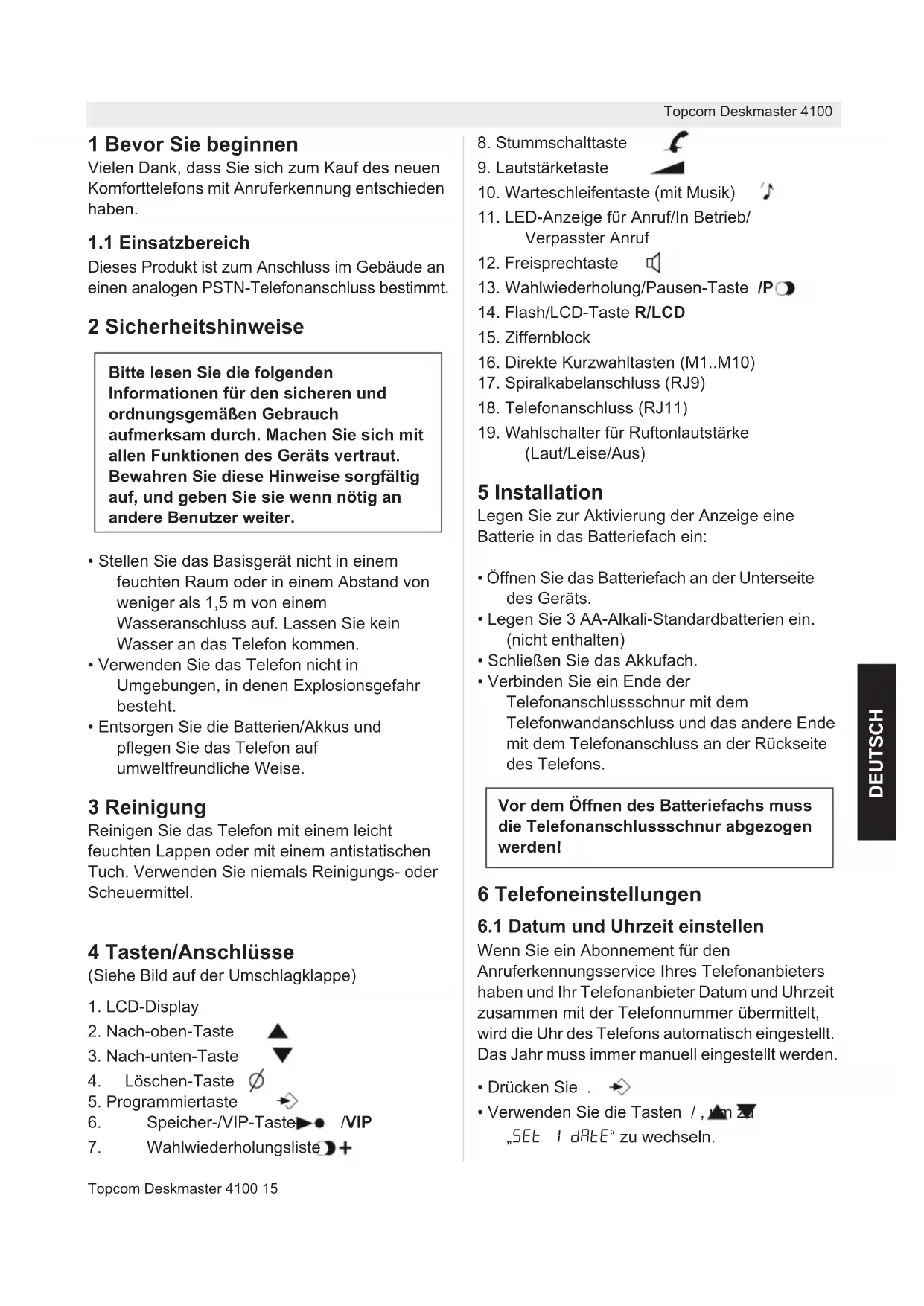 6(7G$W(“ zu wechseln. Bitte lesen Sie die folgenden Informationen für den sicheren und ordnungsgemäßen Gebrauch aufmerksam durch. Machen Sie sich mit allen Funktionen des Geräts vertraut. Bewahren Sie diese Hinweise sorgfältig auf, und geben Sie sie wenn nötig an andere Benutzer weiter. Vor dem Öffnen des Batteriefachs muss die Telefonanschlussschnur abgezogen werden!16 Topcom Deskmaster 4100 Topcom Deskmaster 4100