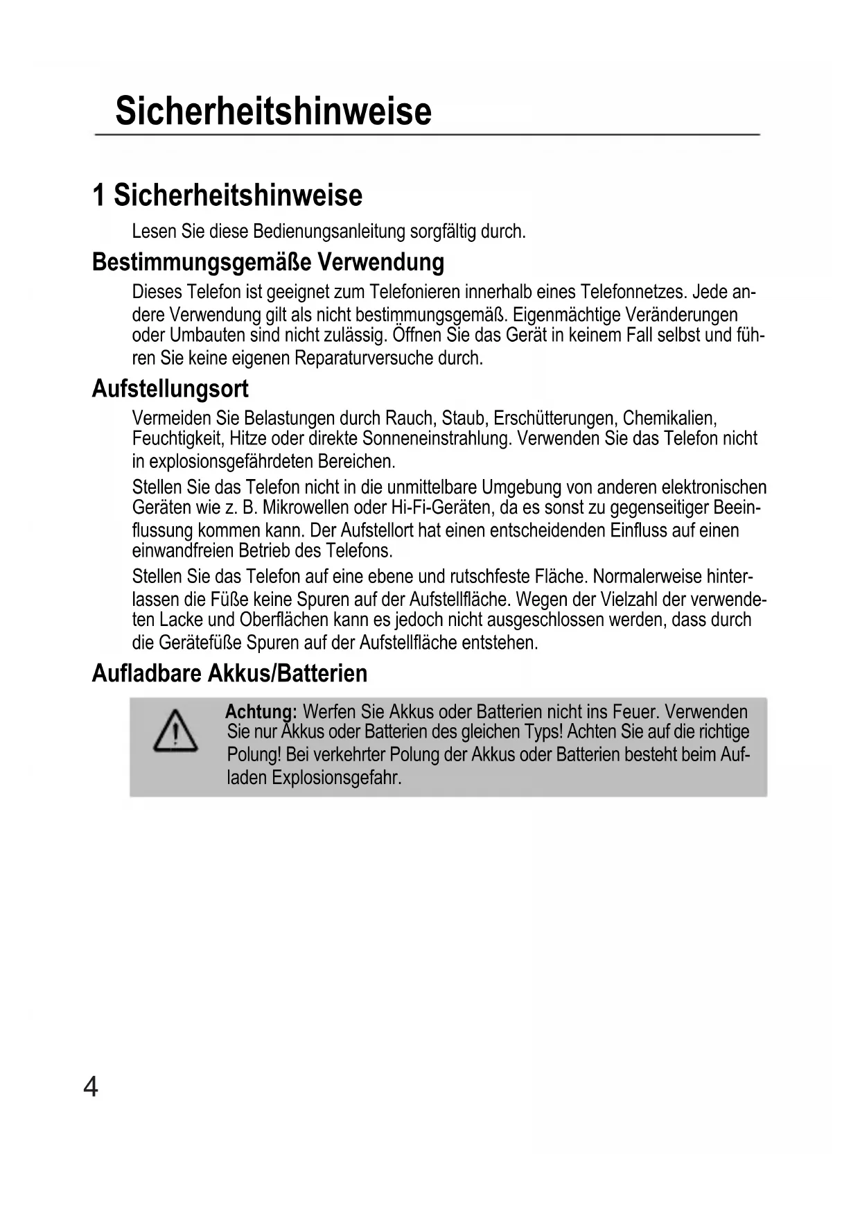 Dieses Telefon ist geeignet zum Telefonieren innerhalb eines Telefonnetzes. Jede andere Verwendung gilt als nicht bestimmungsgemäß. Eigenmächtige Veränderungen oder Umbauten sind nicht zulässig. Öffnen Sie das Gerät in keinem Fall selbst und führen Sie keine eigenen Reparaturversuche durch.