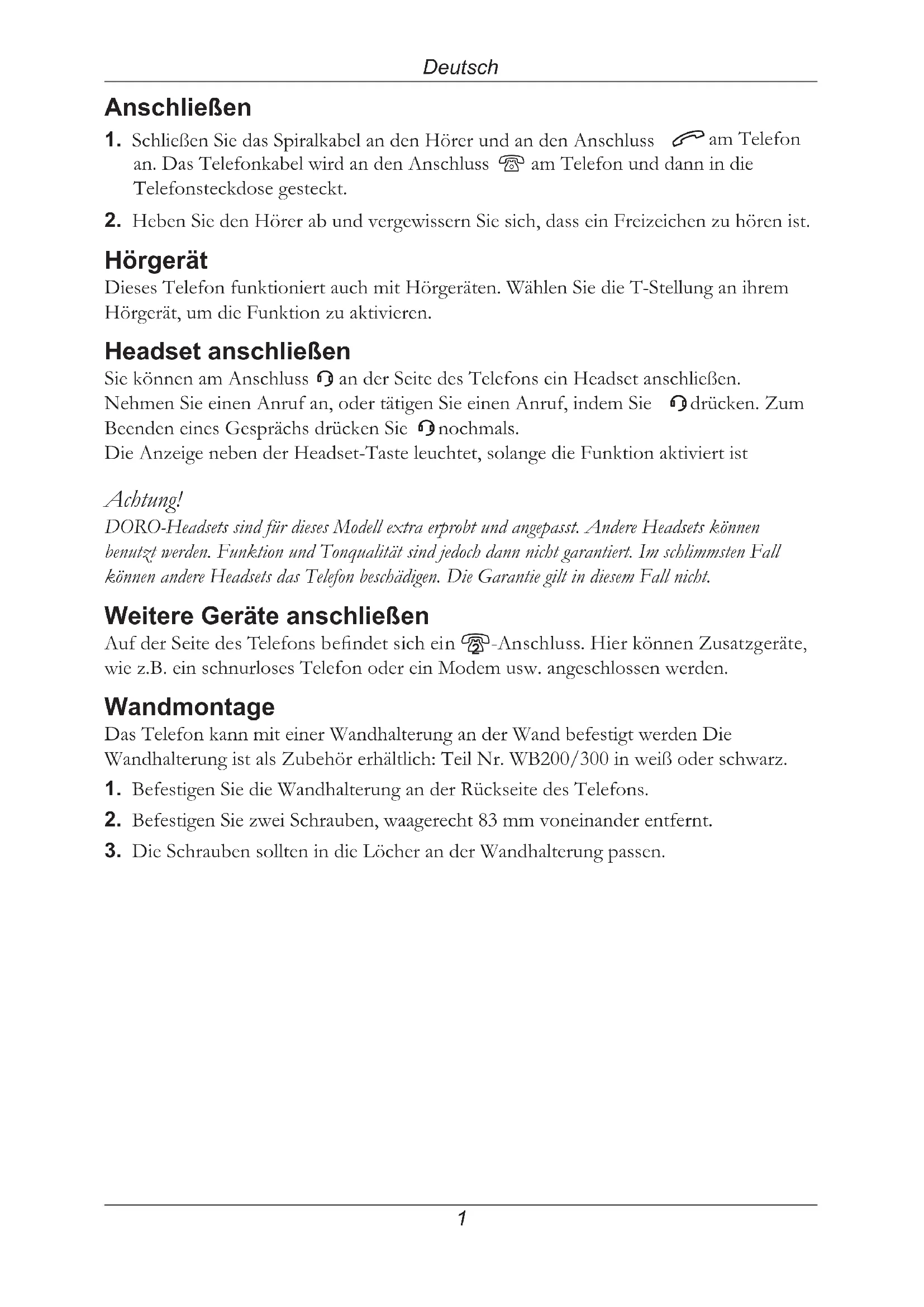 nochmals. Die Anzeige neben der Headset-Taste leuchtet, solange die Funktion aktiviert ist Achtung! DORO-Headsets sind für dieses Modell extra erprobt und angepasst. Andere Headsets können benutzt werden. Funktion und Tonqualität sind jedoch dann nicht garantiert. Im schlimmsten Fall können andere Headsets das Telefon beschädigen. Die Garantie gilt in diesem Fall nicht. Weitere Geräte anschließen Auf der Seite des Telefons bendet sich ein 8-Anschluss. Hier können Zusatzgeräte, wie z.B. ein schnurloses Telefon oder ein Modem usw. angeschlossen werden. Wandmontage Das Telefon kann mit einer Wandhalterung an der Wand befestigt werden Die Wandhalterung ist als Zubehör erhältlich: Teil Nr. WB200/300 in weiß oder schwarz.