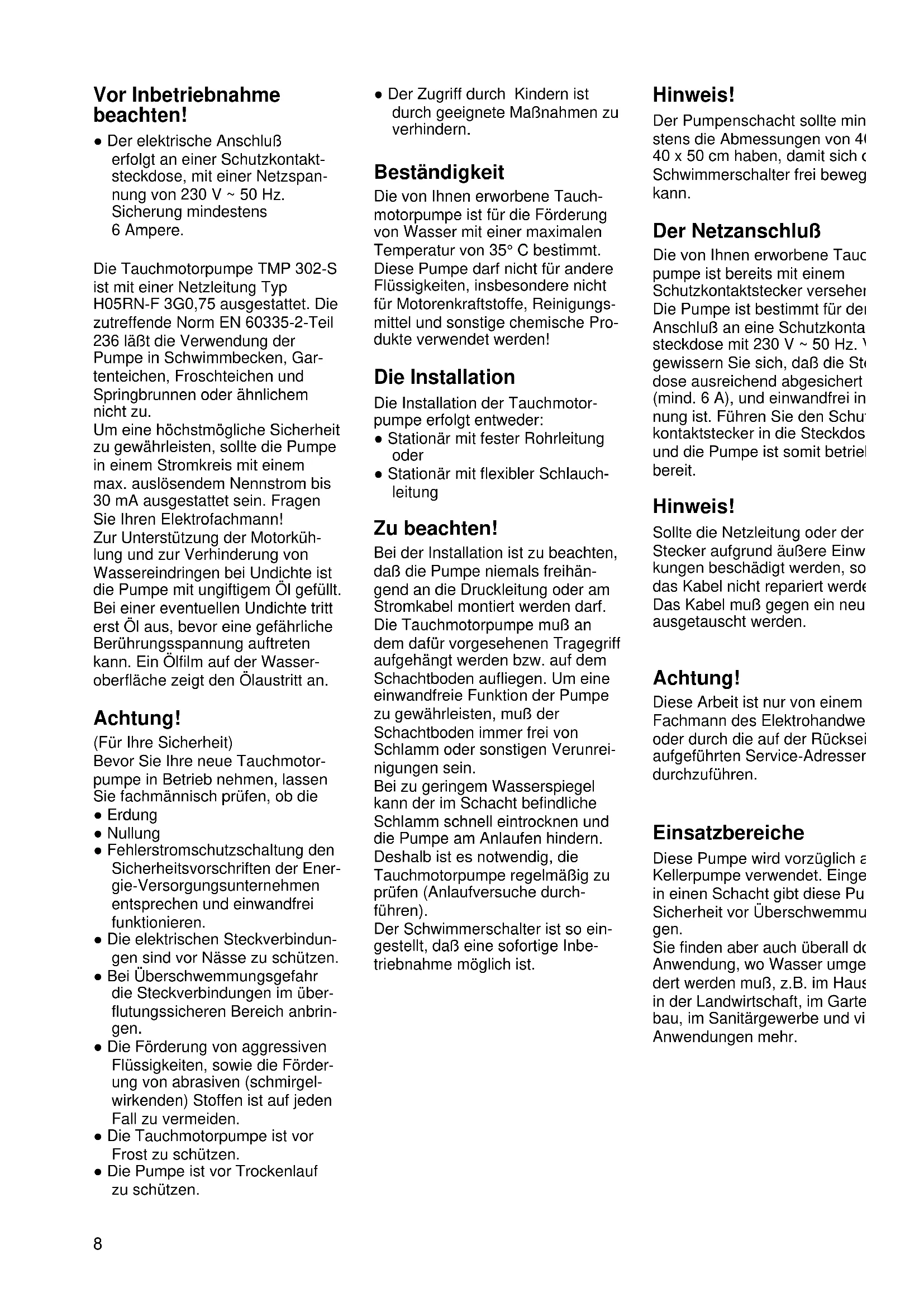 mVor Inbetriebnahme beachten! ● Der elektrische Anschluß erfolgt an einer Schutzkontakt- steckdose, mit einer Netzspan- nung von 230 V ~ 50 Hz. Sicherung mindestens 6 Ampere. Die Tauchmotorpumpe TMP 302-S ist mit einer Netzleitung Typ H05RN-F 3G0,75 ausgestattet. Die zutreffende Norm EN 60335-2-Teil 236 läßt die Verwendung der Pumpe in Schwimmbecken, Gar- tenteichen, Froschteichen und Springbrunnen oder ähnlichem nicht zu. Um eine höchstmögliche Sicherheit zu gewährleisten, sollte die Pumpe in einem Stromkreis mit einem max. auslösendem Nennstrom bis 30 mA ausgestattet sein. Fragen Sie Ihren Elektrofachmann! Zur Unterstützung der Motorküh- lung und zur Verhinderung von Wassereindringen bei Undichte ist die Pumpe mit ungiftigem Öl gefüllt. Bei einer eventuellen Undichte tritt erst Öl aus, bevor eine gefährliche Berührungsspannung auftreten kann. Ein Ölfilm auf der Wasser- oberfläche zeigt den Ölaustritt an. Achtung! (Für Ihre Sicherheit) Bevor Sie Ihre neue Tauchmotor- pumpe in Betrieb nehmen, lassen Sie fachmännisch prüfen, ob die ● Erdung ● Nullung ● Fehlerstromschutzschaltung den Sicherheitsvorschriften der Ener- gie-Versorgungsunternehmen entsprechen und einwandfrei funktionieren. ● Die elektrischen Steckverbindun- gen sind vor Nässe zu schützen. ● Bei Überschwemmungsgefahr die Steckverbindungen im über- flutungssicheren Bereich anbrin- gen. ● Die Förderung von aggressiven Flüssigkeiten, sowie die Förder- ung von abrasiven (schmirgel- wirkenden) Stoffen ist auf jeden Fall zu vermeiden. ● Die Tauchmotorpumpe ist vor Frost zu schützen. ● Die Pumpe ist vor Trockenlauf zu schützen. Hinweis! Der Pumpenschacht sollte min stens die Abmessungen von 40 40 x 50 cm haben, damit sich d Schwimmerschalter frei beweg kann. Der Netzanschluß Die von Ihnen erworbene Tauc pumpe ist bereits mit einem Schutzkontaktstecker versehen Die Pumpe ist bestimmt für den Anschluß an eine Schutzkontak steckdose mit 230 V ~ 50 Hz. V gewissern Sie sich, daß die Ste dose ausreichend abgesichert (mind. 6 A), und einwandfrei in nung ist. Führen Sie den Schut kontaktstecker in die Steckdose und die Pumpe ist somit betrieb bereit. Hinweis! Sollte die Netzleitung oder der Stecker aufgrund äußere Einwi kungen beschädigt werden, so das Kabel nicht repariert werde Das Kabel muß gegen ein neue ausgetauscht werden. Achtung! Diese Arbeit ist nur von einem Fachmann des Elektrohandwer oder durch die auf der Rücksei aufgeführten Service-Adressen durchzuführen. Einsatzbereiche Diese Pumpe wird vorzüglich a Kellerpumpe verwendet. Einge in einen Schacht gibt diese Pum Sicherheit vor Überschwemmu gen. Sie finden aber auch überall do Anwendung, wo Wasser umge dert werden muß, z.B. im Haus in der Landwirtschaft, im Garte bau, im Sanitärgewerbe und vie Anwendungen mehr. ● Der Zugriff durch Kindern ist durch geeignete Maßnahmen zu verhindern. Beständigkeit Die von Ihnen erworbene Tauch- motorpumpe ist für die Förderung von Wasser mit einer maximalen Temperatur von 35° C bestimmt. Diese Pumpe darf nicht für andere Flüssigkeiten, insbesondere nicht für Motorenkraftstoffe, Reinigungs- mittel und sonstige chemische Pro- dukte verwendet werden! Die Installation Die Installation der Tauchmotor- pumpe erfolgt entweder: ● Stationär mit fester Rohrleitung oder ● Stationär mit flexibler Schlauch- leitung Zu beachten! Bei der Installation ist zu beachten, daß die Pumpe niemals freihän- gend an die Druckleitung oder am Stromkabel montiert werden darf. Die Tauchmotorpumpe muß an dem dafür vorgesehenen Tragegriff aufgehängt werden bzw. auf dem Schachtboden aufliegen. Um eine einwandfreie Funktion der Pumpe zu gewährleisten, muß der Schachtboden immer frei von Schlamm oder sonstigen Verunrei- nigungen sein. Bei zu geringem Wasserspiegel kann der im Schacht befindliche Schlamm schnell eintrocknen und die Pumpe am Anlaufen hindern. Deshalb ist es notwendig, die Tauchmotorpumpe regelmäßig zu prüfen (Anlaufversuche durch- führen). Der Schwimmerschalter ist so ein- gestellt, daß eine sofortige Inbe- triebnahme möglich ist. 8Die Inbetriebnahme Nachdem Sie diese Installations- und Betriebsanweisung genau gelesen haben, können Sie unter Beachtung folgender Punkte Ihre neue Pumpe in Betrieb nehmen: ● Prüfen Sie, ob die Pumpe auf dem Schachtboden liegt. ● Prüfen Sie, ob die Druckleitung ordnungsgemäß angebracht wurde . ● Vergewissern Sie sich, daß der elektrische Anschluß 230 V ~ 50 Hz beträgt. ● Überprüfen Sie den ordnungs- gemäßen Zustand der elektri- schen Steckdose. ● Vergewissern Sie sich, daß nie- mals Feuchtigkeit oder Wasser an den Netzanschluß kommt. ● Vermeiden Sie, daß die Pumpe trocken läuft. Wartungshinweise! Die Tauchmotorpumpe ist ein war- tungsfreies und bewährtes Quali- tätserzeugnis, das strengen End- kontrollen unterworfen wird. Für eine lange Lebensdauer und ununterbrochenen Betrieb empfeh- len wir jedoch eine regelmäßige Kontrolle und Pflege. Achtung! Wichtig! ● Vor jeder Wartungsarbeit den Netzstecker ziehen. ● Bei transportabler Verwendung sollte die Pumpe nach jedem Gebrauch mit klarem Wasser gereinigt werden. ● Bei stationärer Installation emp- fiehlt sich alle 3 Monate die Funktion des Schwimmerschal- ters zu überprüfen. ● Fusseln und faserige Partike die sich im Pumpengehäuse eventuell festgesetzt haben, einem Wasserstrahl entferne ● Bei zu starker Ablagerung im Pumpengehäuse muß der Ansaugfilter vom Pumpende getrennt werden (kräftiges Z hen am Ansaugfilter). Pump gehäuse reinigen und den Ansaugfilter wieder einbauen ● Alle 3 Monate Schachtboden von Schlamm befreien und a die Schachtwände reinigen. ● Den Schwimmerschalter von Ablagerungen mit klarem Wa ser reinigen. Störungen – Ursachen – Abhilfe Störungen Pumpe läuft nicht an Pumpe fördert nicht Pumpe schaltet nicht aus Fördermenge ungenügend Pumpe schaltet nach kurzer Laufzeit ab Ursachen – Netzspannung fehlt – Schwimmerschal