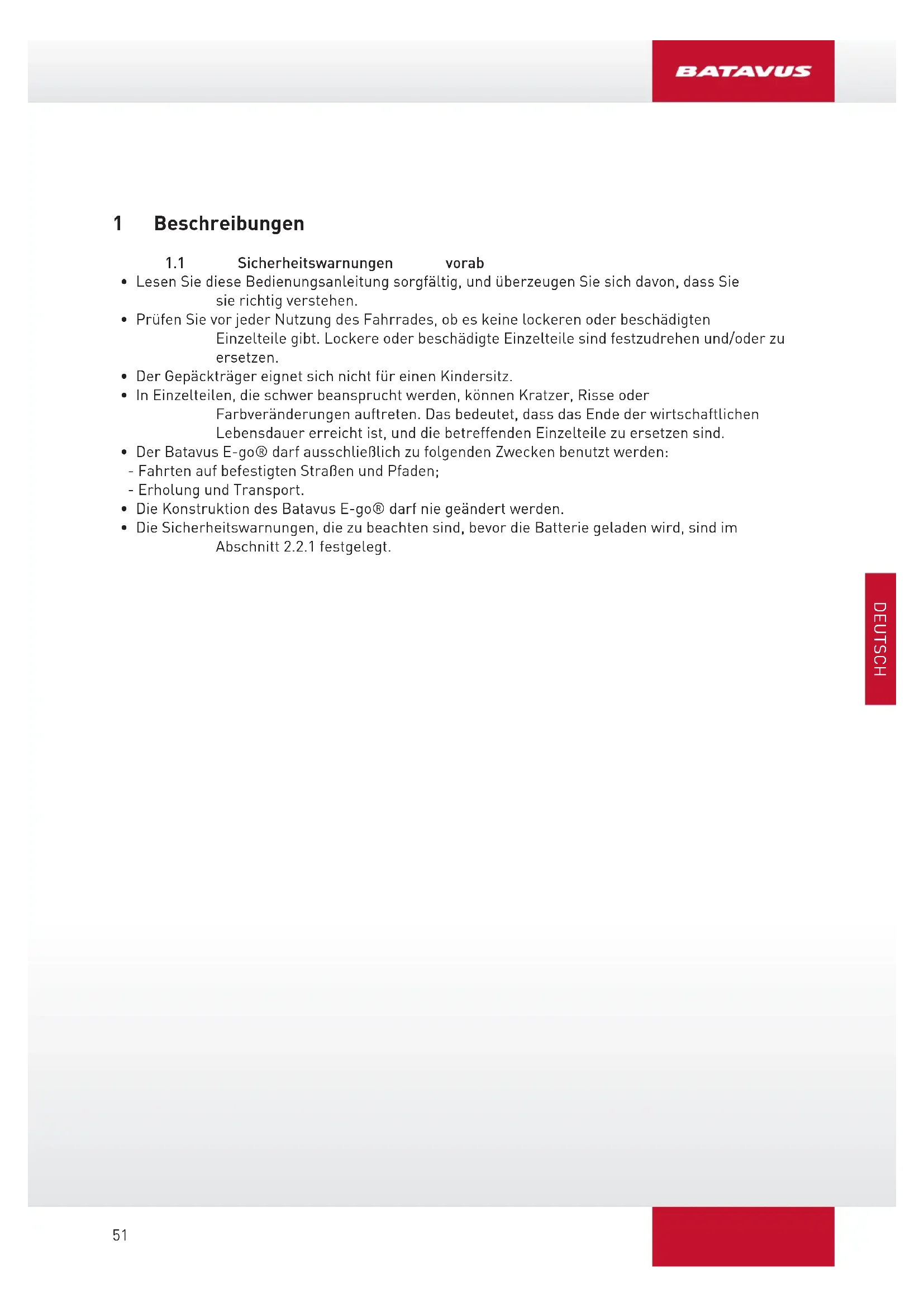 Sie die nachfolgenden Warnungen sorgfältig. Batavus haftet nicht für Unfälle oder Störungen aufgrund falscher Nutzung [einzelner Teile] des E-Bikes.