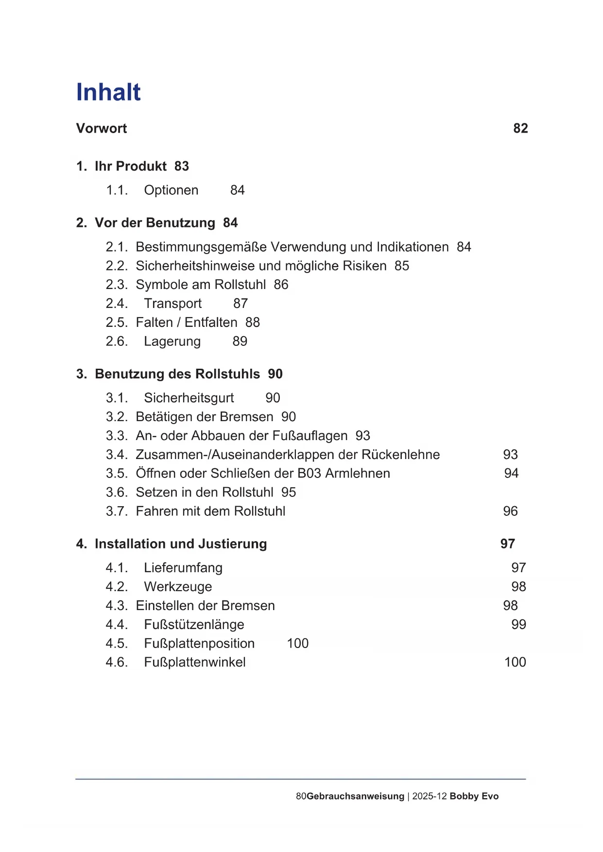 4.1. Lieferumfang 97 4.2. Werkzeuge 98 4.3. Einstellen der Bremsen 98 4.4. Fußstützenlänge 99 4.5. Fußplattenposition 100 4.6. Fußplattenwinkel 100 Inhalt81 Bobby EvoGebrauchsanweisung | 2025-12