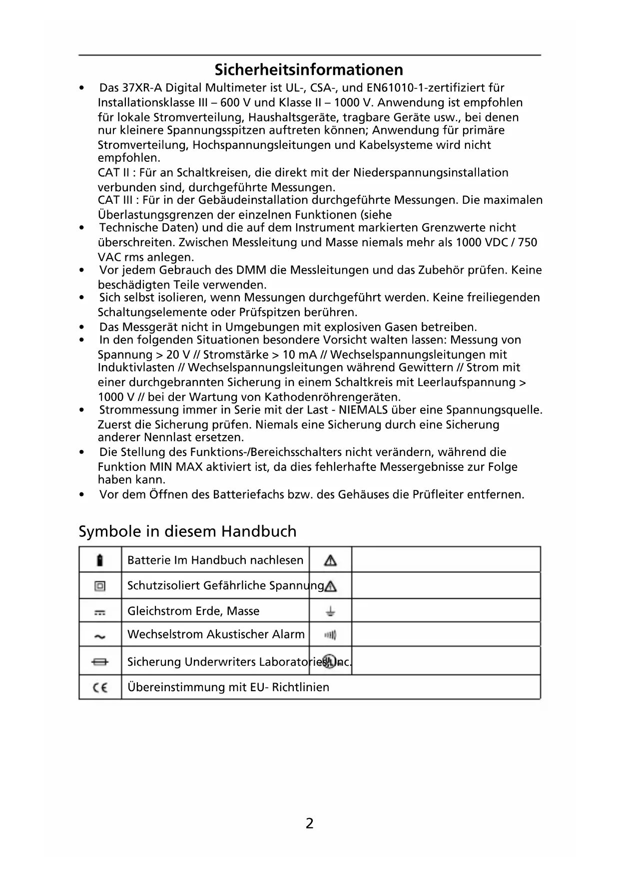 - Vor dem Öffnen des Batteriefachs bzw. des Gehäuses die Prüfleiter entfernen. Symbole in diesem Handbuch Batterie Im Handbuch nachlesen Schutzisoliert Gefährliche Spannung Gleichstrom Erde, Masse Wechselstrom Akustischer Alarm Sicherung Underwriters Laboratories, Inc. Übereinstimmung mit EU- Richtlinien3 Einleitung Das Modell 37XR-A ist ein handgehaltenes Multimeter mit Effektivwert- Wechselspannung (True rms) und automatischer Bereichswahl, das folgende Mess- und Testfunktionen bietet: