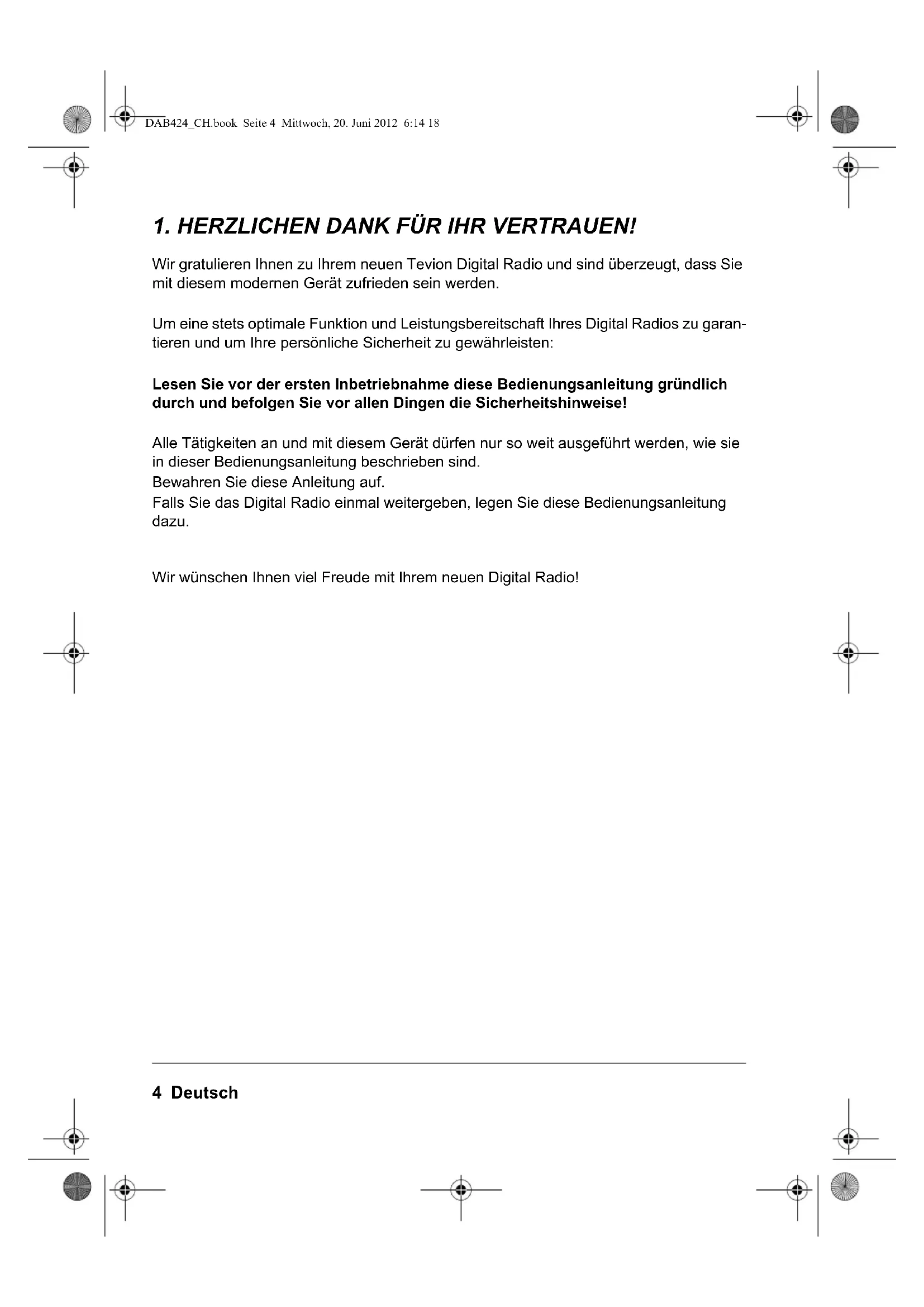 Wir gratulieren Ihnen zu Ihrem neuen Tevion Digital Radio und sind überzeugt, dass Sie mit diesem modernen Gerät zufrieden sein werden. Um eine stets optimale Funktion und Leistungsbereitschaft Ihres Digital Radios zu garan- tieren und um Ihre persönliche Sicherheit zu gewährleisten: Lesen Sie vor der ersten Inbetriebnahme diese Bedienungsanleitung gründlich durch und befolgen Sie vor allen Dingen die Sicherheitshinweise! Alle Tätigkeiten an und mit diesem Gerät dürfen nur so weit ausgeführt werden, wie sie in dieser Bedienungsanleitung beschrieben sind. Bewahren Sie diese Anleitung auf. Falls Sie das Digital Radio einmal weitergeben, legen Sie diese Bedienungsanleitung dazu. Wir wünschen Ihnen viel Freude mit Ihrem neuen Digital Radio! DAB424_CH.book Seite 4 Mittwoch, 20. Juni 2012 6:14 18Deutsch 5