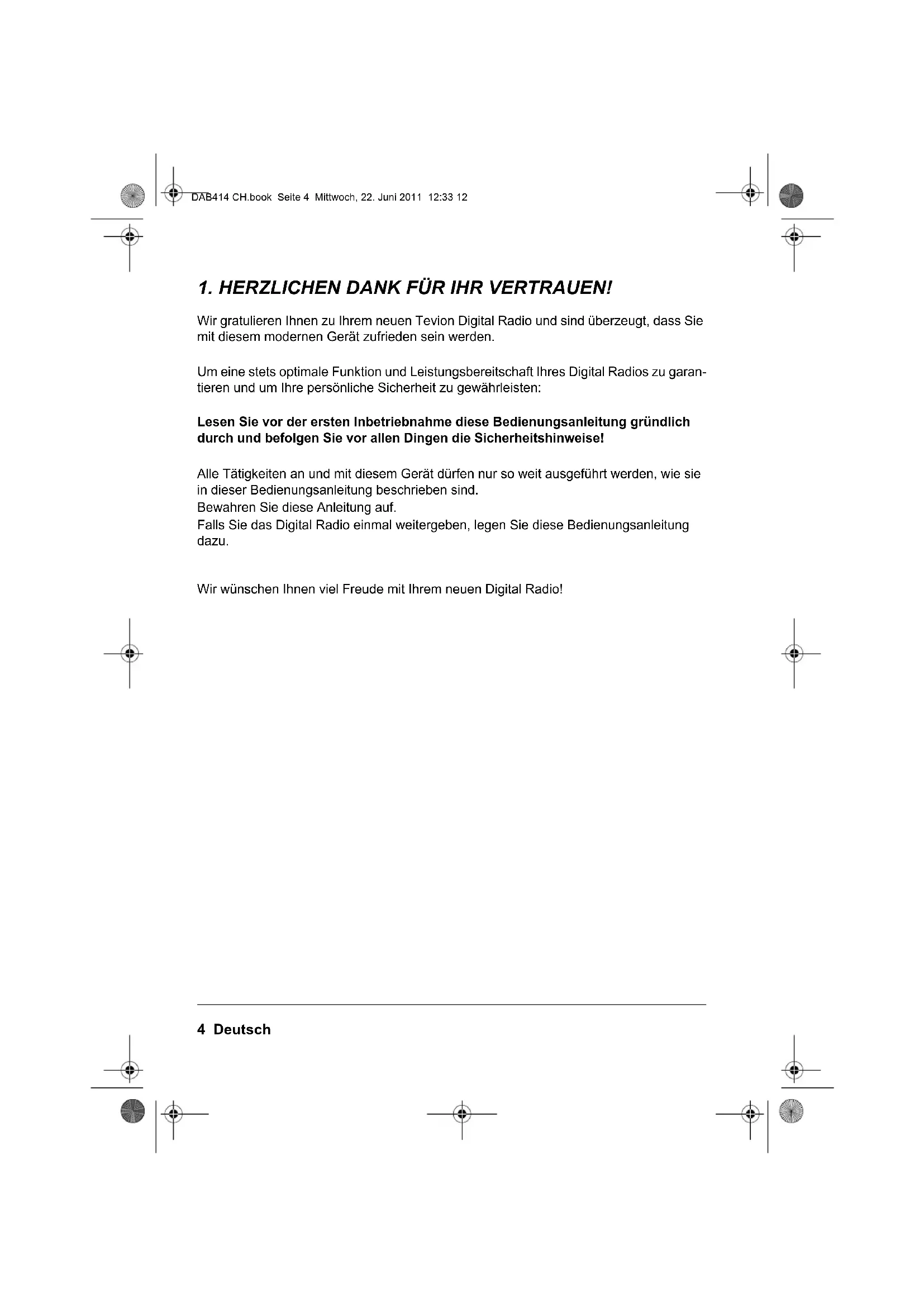 Wir gratulieren Ihnen zu Ihrem neuen Tevion Digital Radio und sind überzeugt, dass Sie mit diesem modernen Gerät zufrieden sein werden. Um eine stets optimale Funktion und Leistungsbereitschaft Ihres Digital Radios zu garan- tieren und um Ihre persönliche Sicherheit zu gewährleisten: Lesen Sie vor der ersten Inbetriebnahme diese Bedienungsanleitung gründlich durch und befolgen Sie vor allen Dingen die Sicherheitshinweise! Alle Tätigkeiten an und mit diesem Gerät dürfen nur so weit ausgeführt werden, wie sie in dieser Bedienungsanleitung beschrieben sind. Bewahren Sie diese Anleitung auf. Falls Sie das Digital Radio einmal weitergeben, legen Sie diese Bedienungsanleitung dazu. Wir wünschen Ihnen viel Freude mit Ihrem neuen Digital Radio! DAB414 CH.book Seite 4 Mittwoch, 22. Juni 2011 12:33 12Deutsch 5