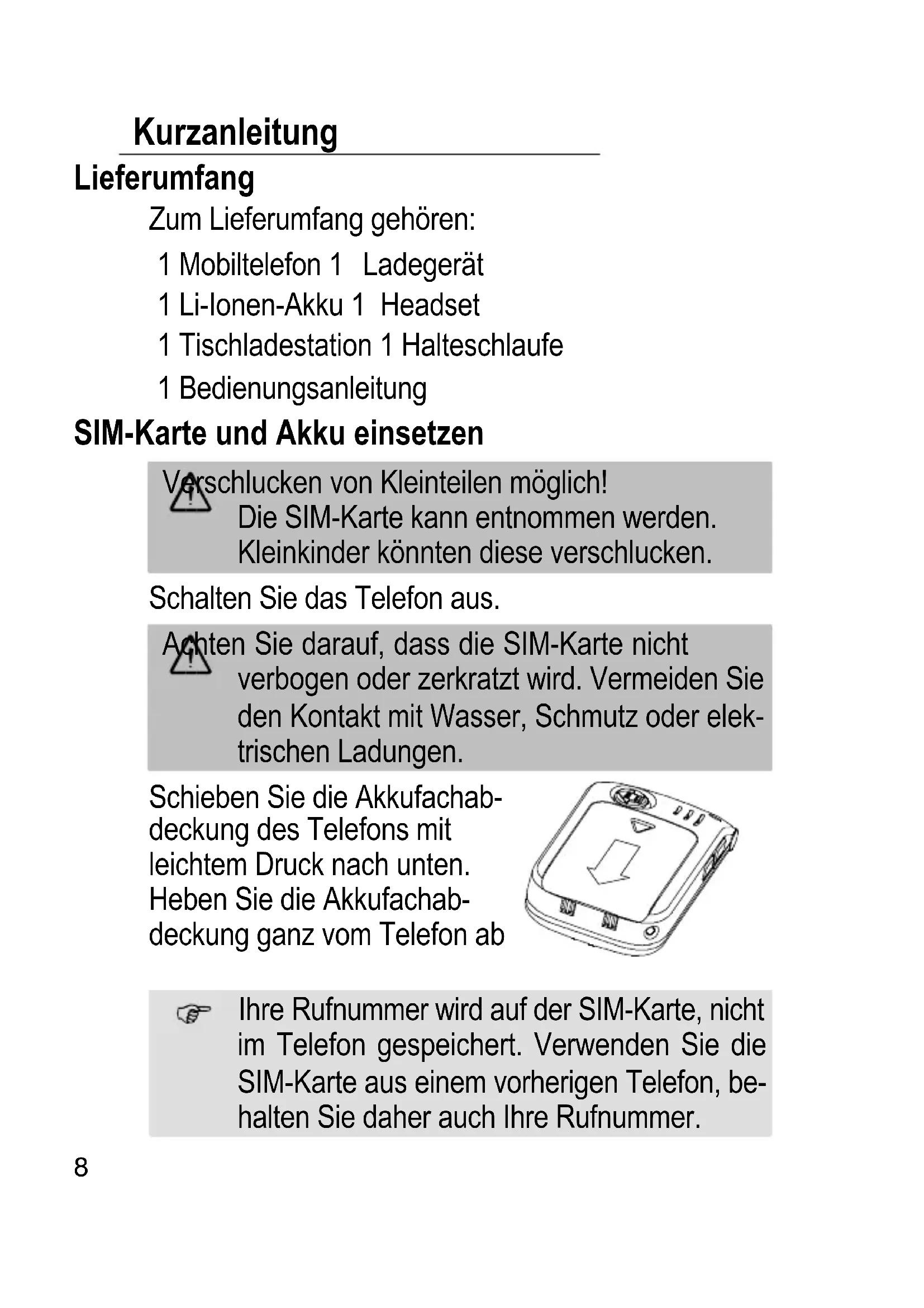 Verschlucken von Kleinteilen möglich! Die SIM-Karte kann entnommen werden. Kleinkinder konnten diese verschlucken.